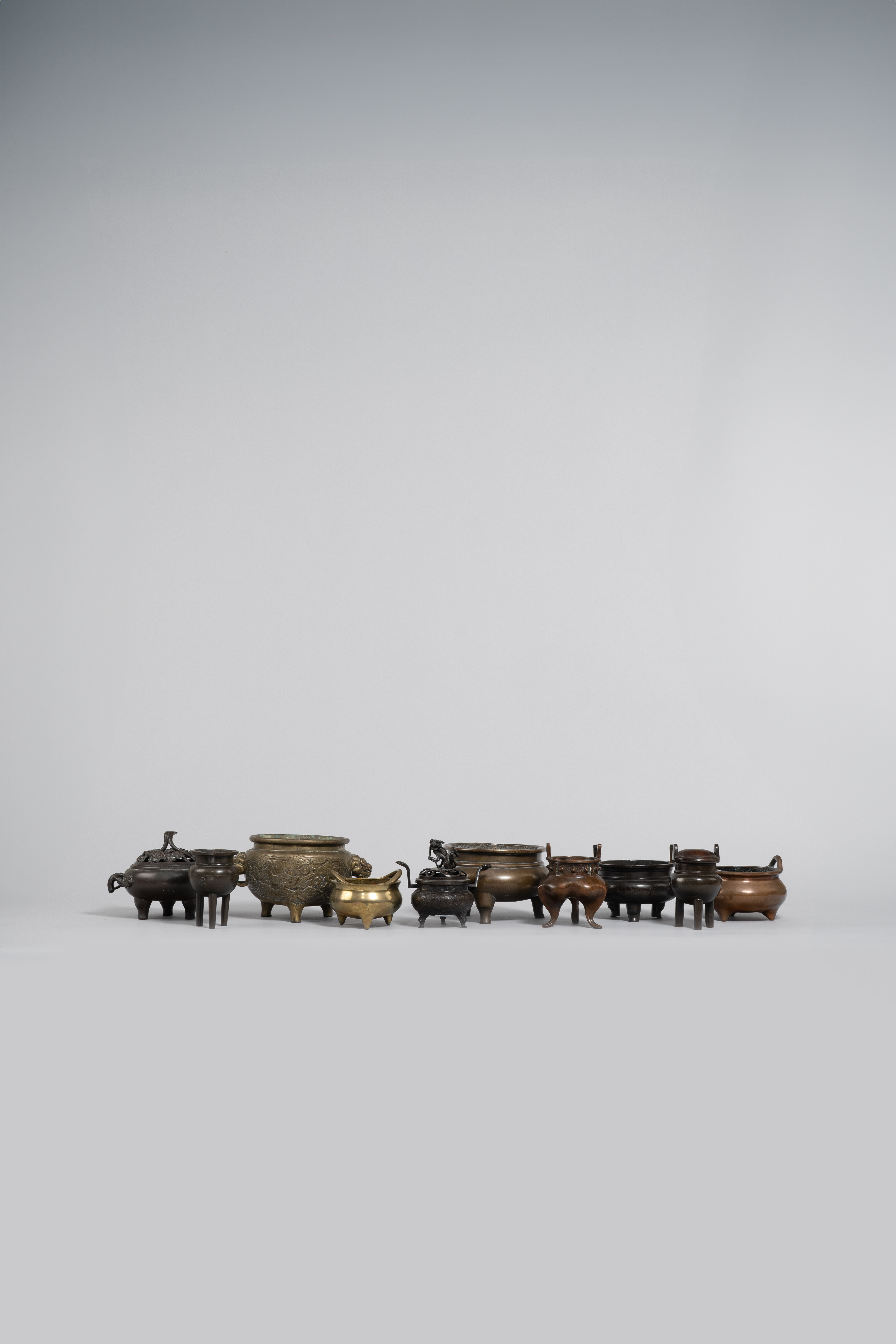 A COLLECTION OF TEN BRONZE TRIPOD INCENSE BURNERS