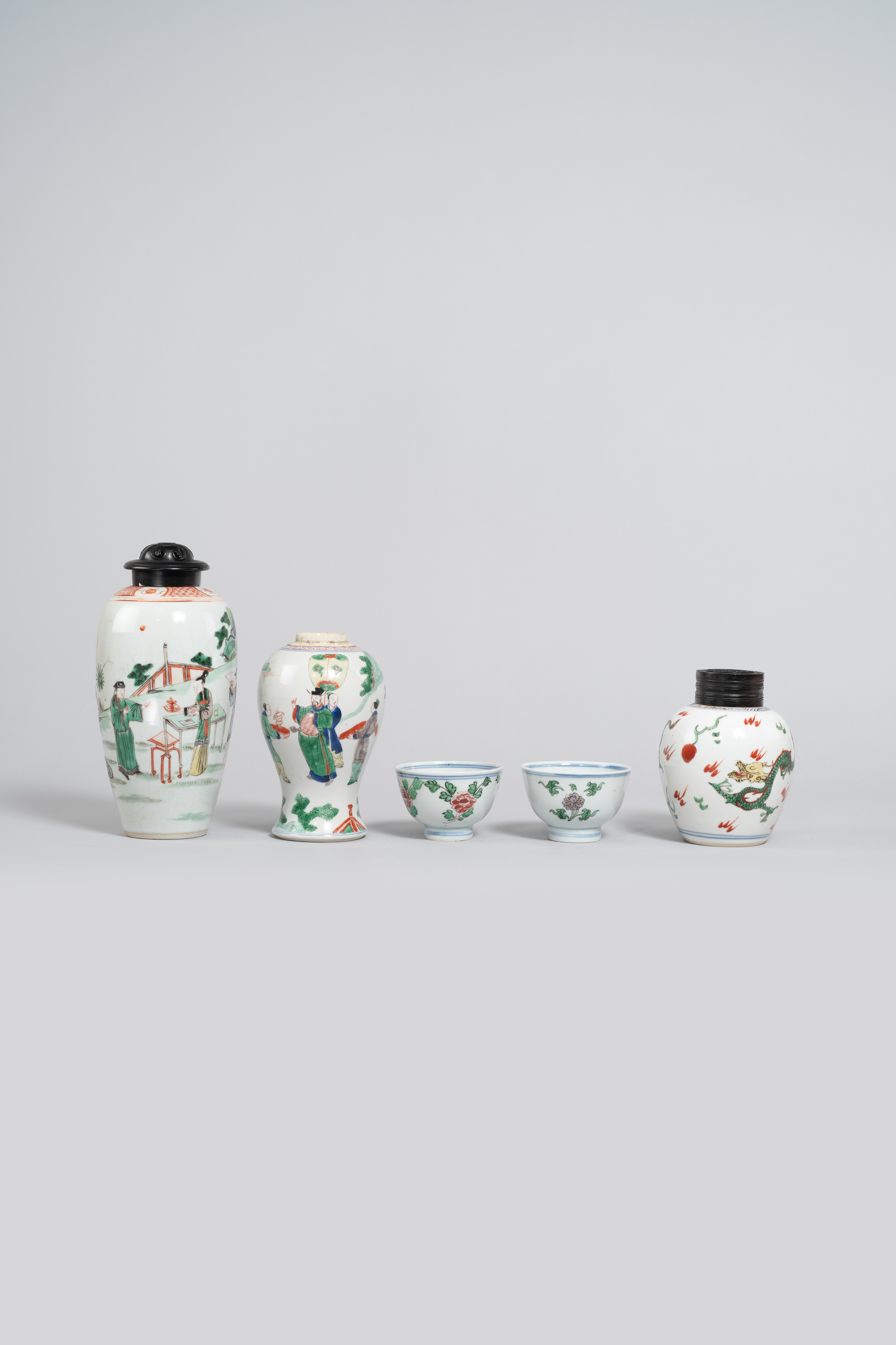 Comprising: three vases and two cups, the vases painted with figures and one with two dragons, the cups with flower sprays, together with two wood covers, 22cm. (7)