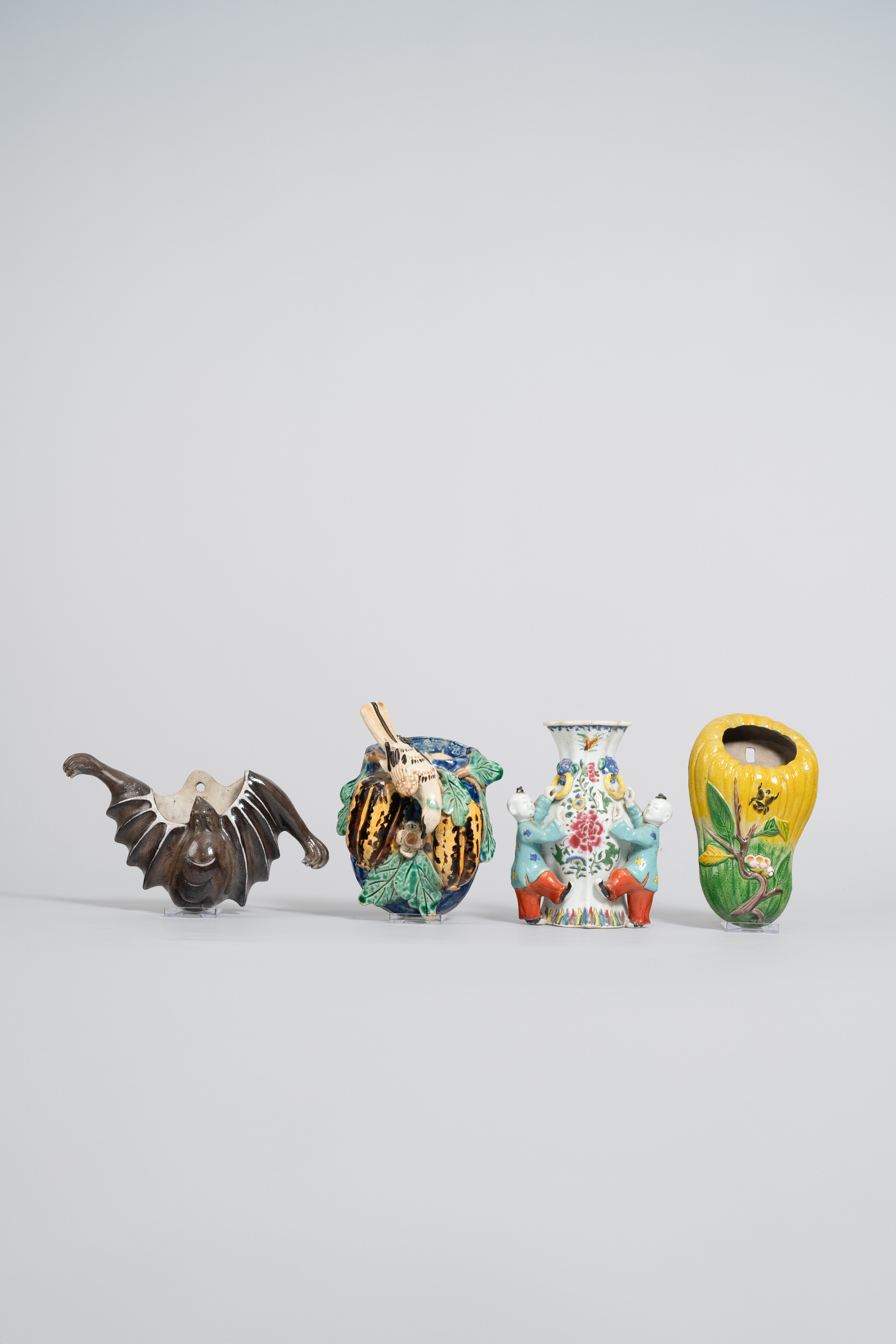 One formed as a vase flanked by two boys, the others variously formed as a bat, a gourd, and a bird perched on a melon vine, 23cm max. (4)