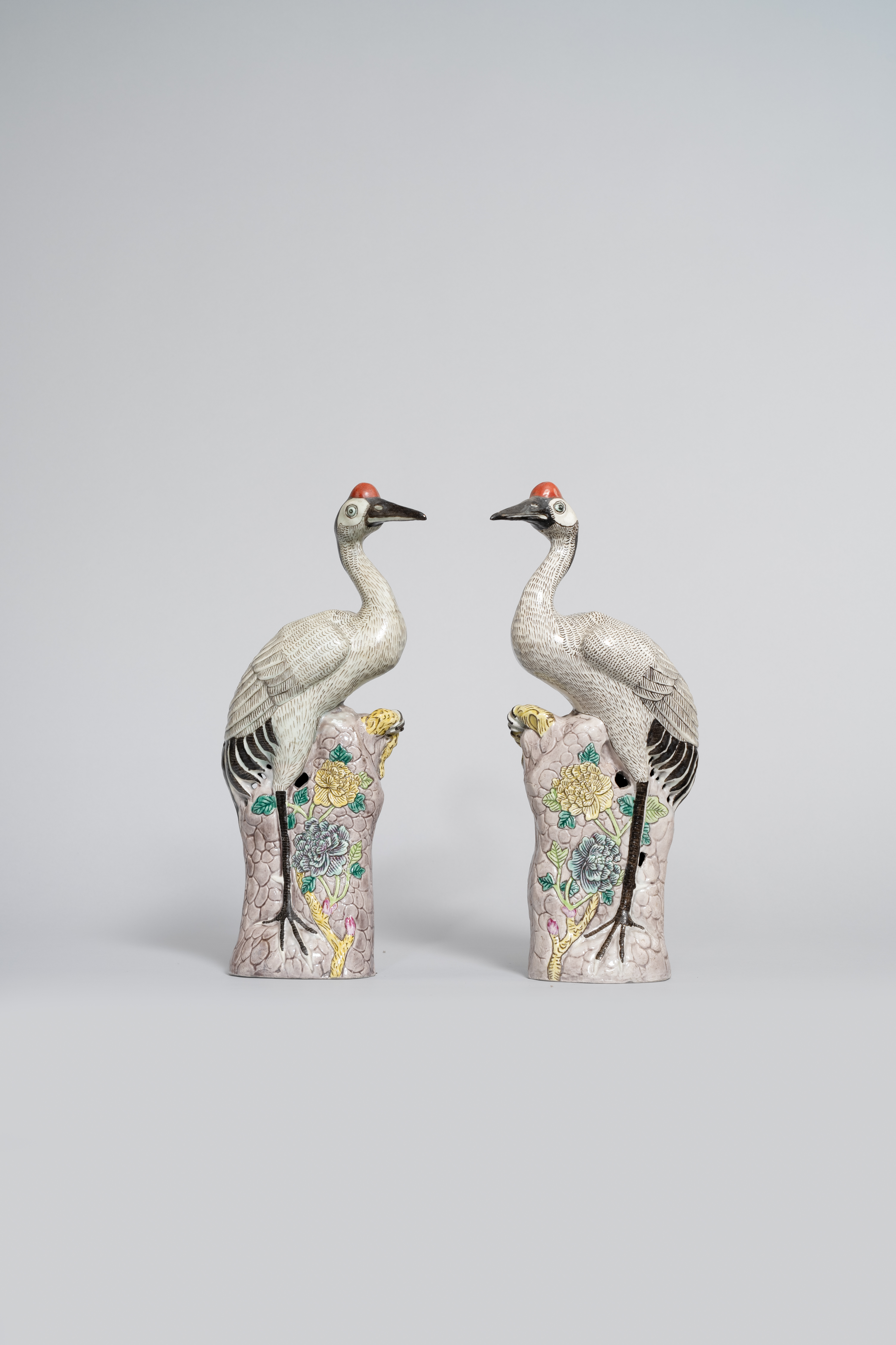 A PAIR OF CHINESE FAMILLE ROSE MODELS OF CRANES