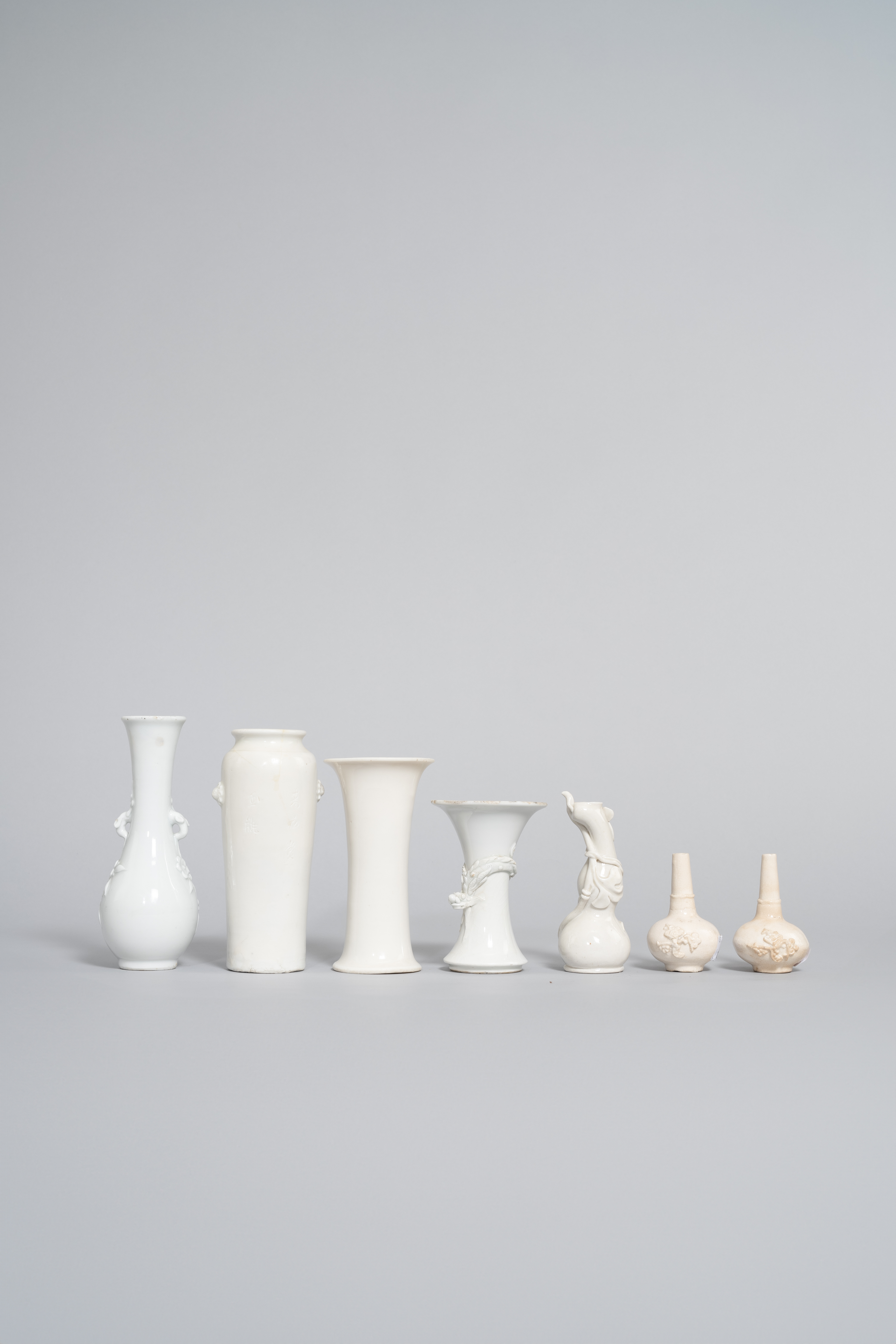 Variously decorated with flowers, calligraphy and a dragon, together with two small white-glazed vases, 16cm. (7)