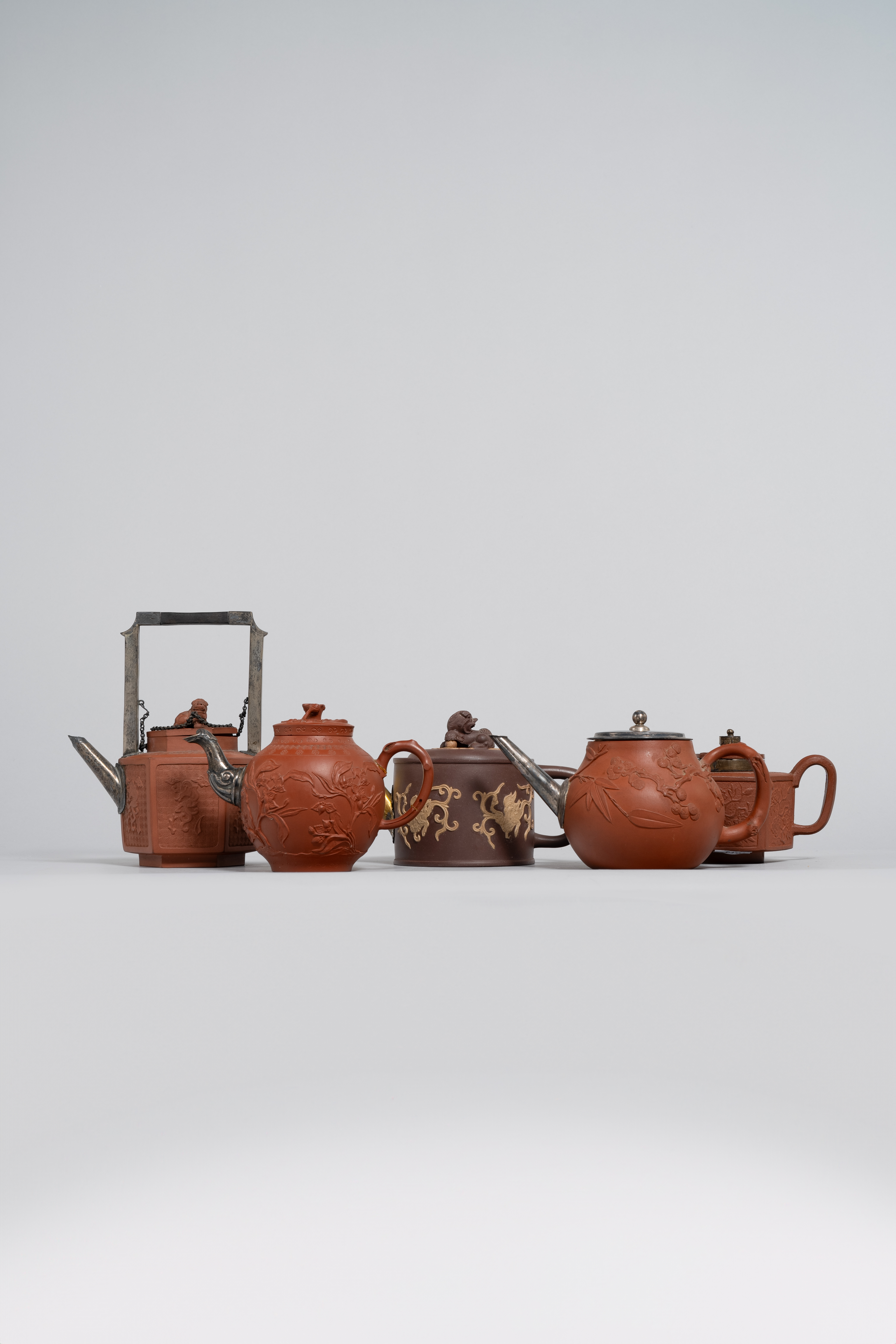 Variously shaped and decorated with flowers, foliage, bamboo, pine and dragons; four with replacement metal spouts, one with a replacement metal cover, the fifth teapot with later metal fittings; the cylindrical teapot, with an impressed mark to the cover, 18cm max. (10)