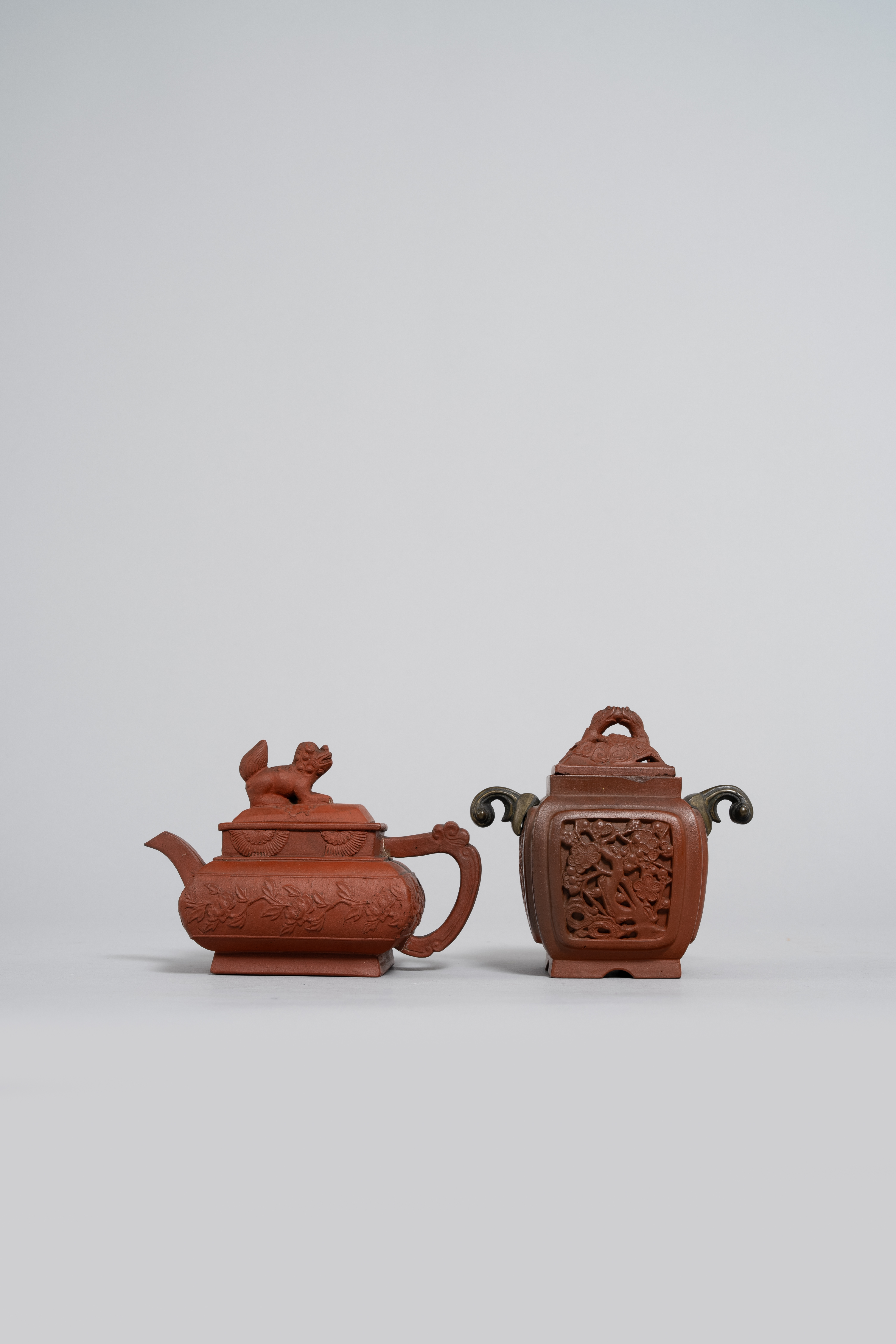 The teapot with a shallow rectangular body decorated with moulded bands of peony; the sugar pot with panels of prunus and applied with metal handles, both with associated covers, 13.5cm max. (4)
