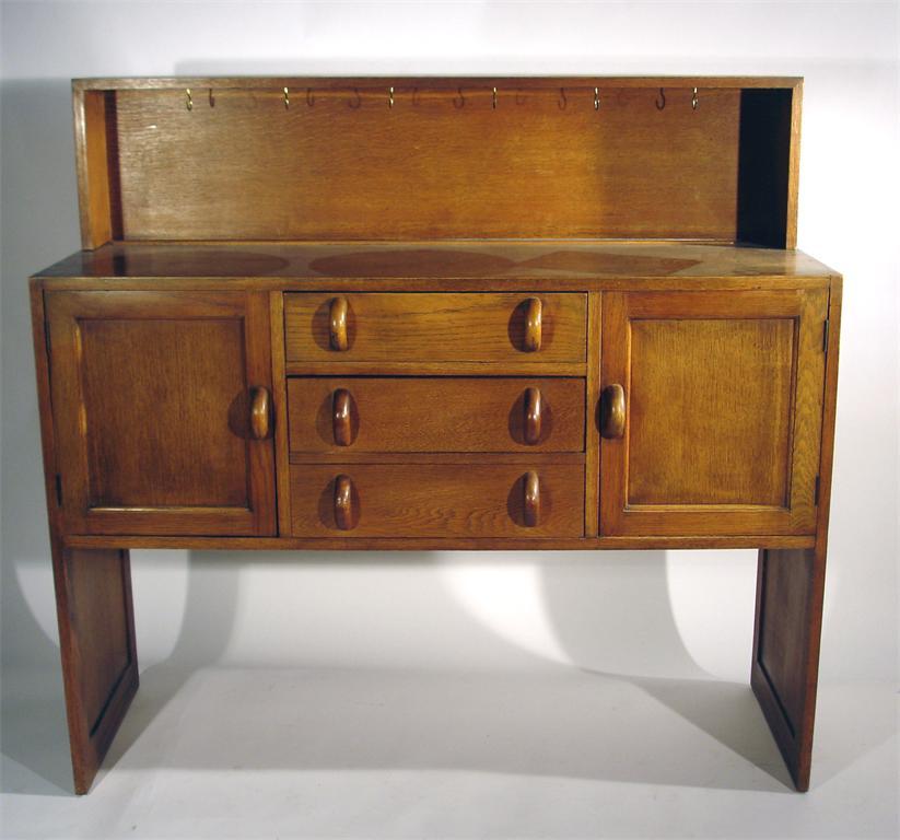 A oak sideboard probably Heal's with cup rail over mantel. unsigned 129 x 122.5cm