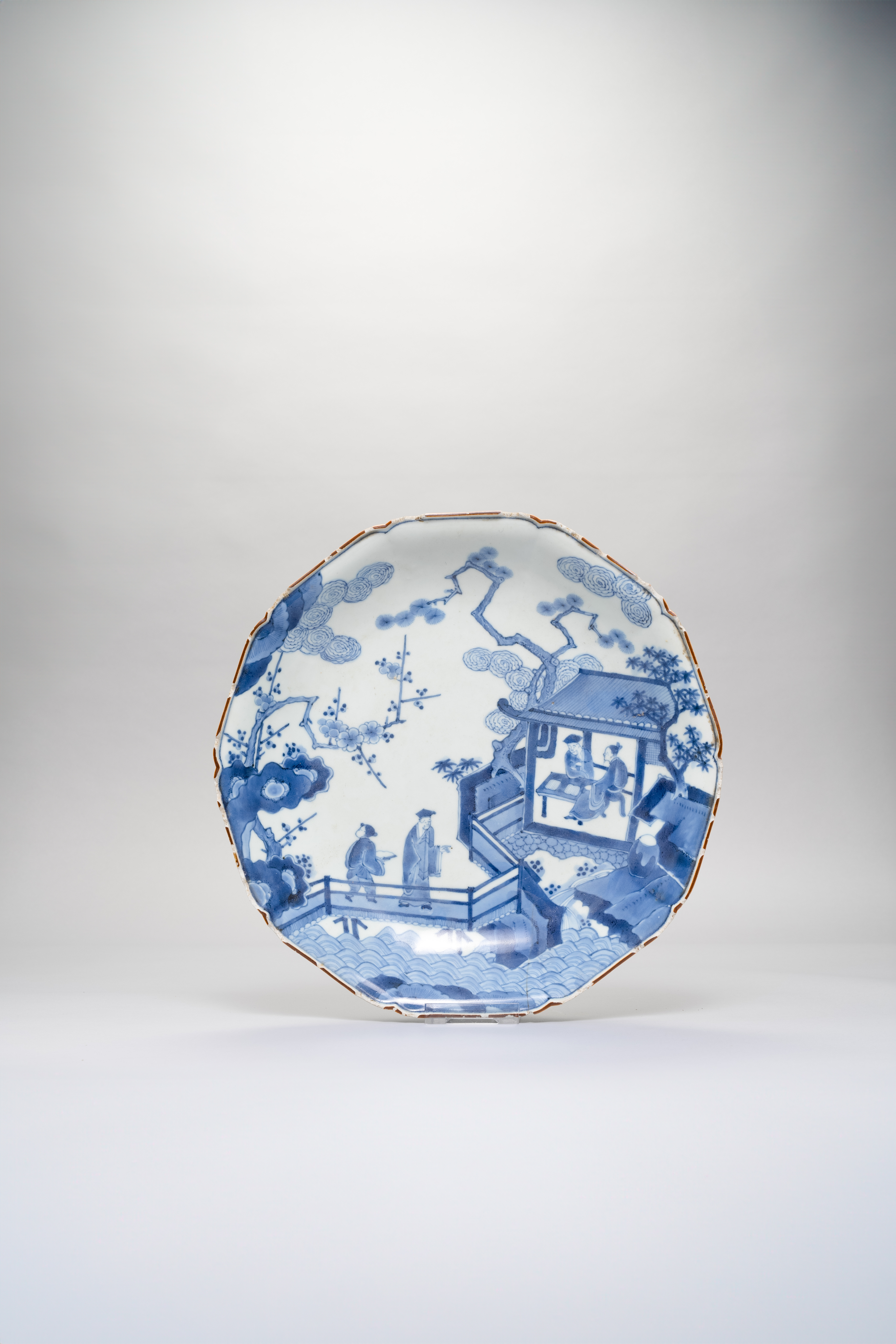 The foliate dish decorated in underglaze blue and with a brown rim, painted with two men in Chinese garments seated in a pavilion and two others on a bridge, with prunus, pine and maple trees issuing from rockwork to the side, and scrolling clouds above; the reverse painted with a continuous band of karakusa scrolls and a fuku mark, 29.8cm.
