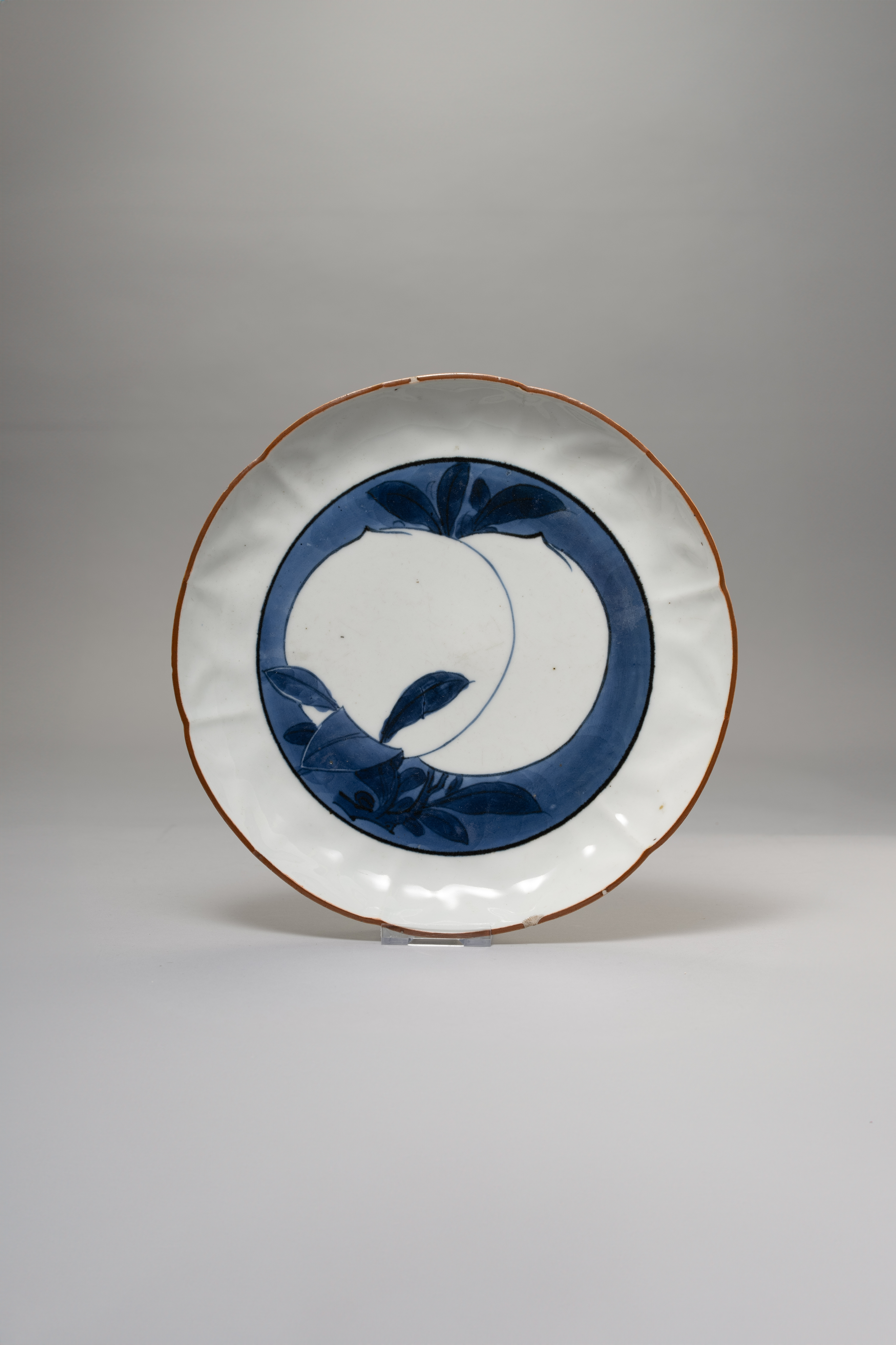The foliate body painted with a central medallion enclosing two large peaches on a leafy branch, with a brown rim and three concentric rings to the reverse, the base with a fuku mark, 21.3cm.