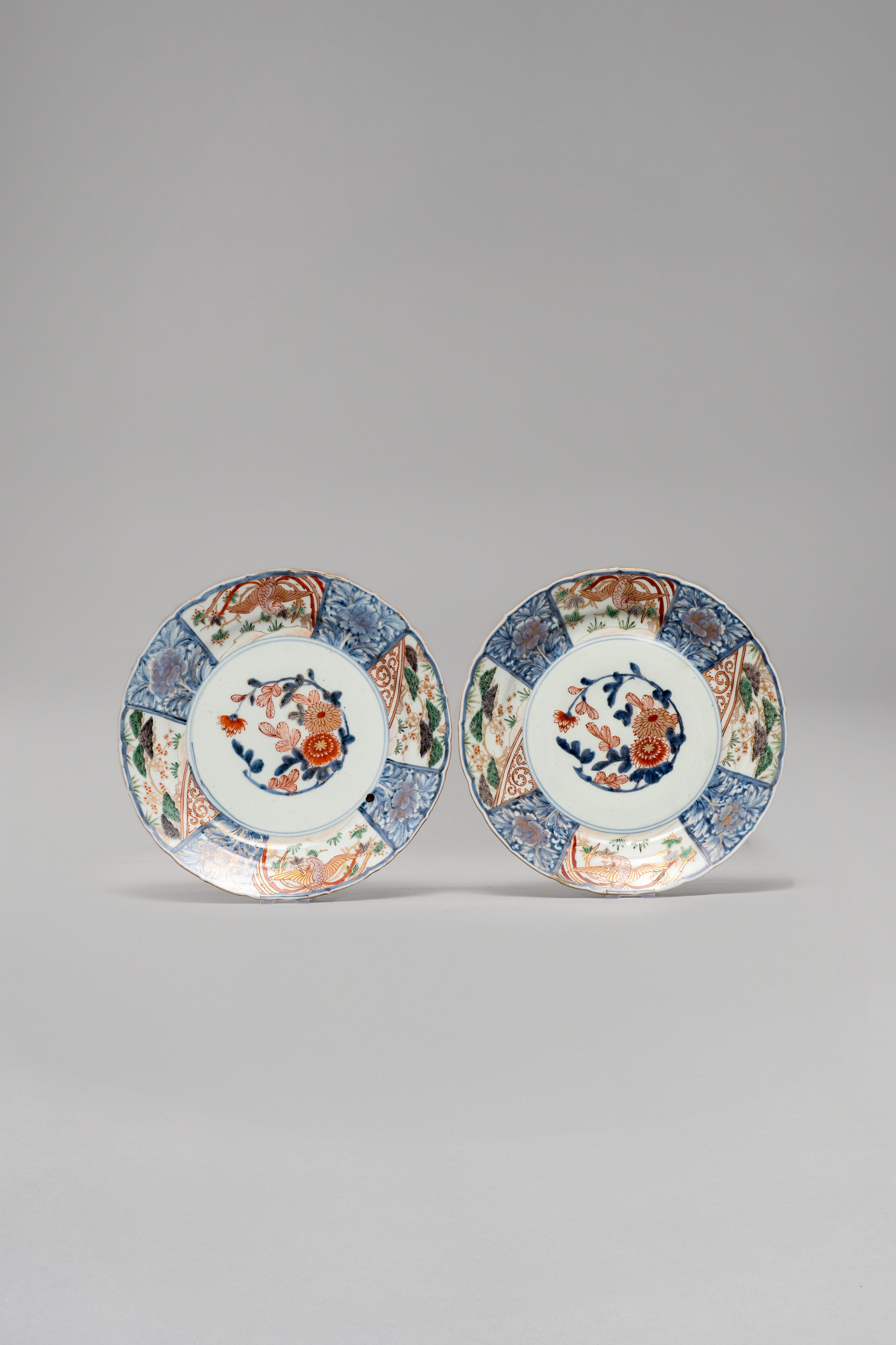 Both with a foliate rim and decorated in underglaze blue, gilt and polychrome enamels with a spray of chrysanthemum to the centre, framed by alternating panels enclosing ho-o birds, plants and scrolling tendrils; each with a band of karakusa scrolls to the reverse, 27.8cm and 28.5cm respectively. (2)