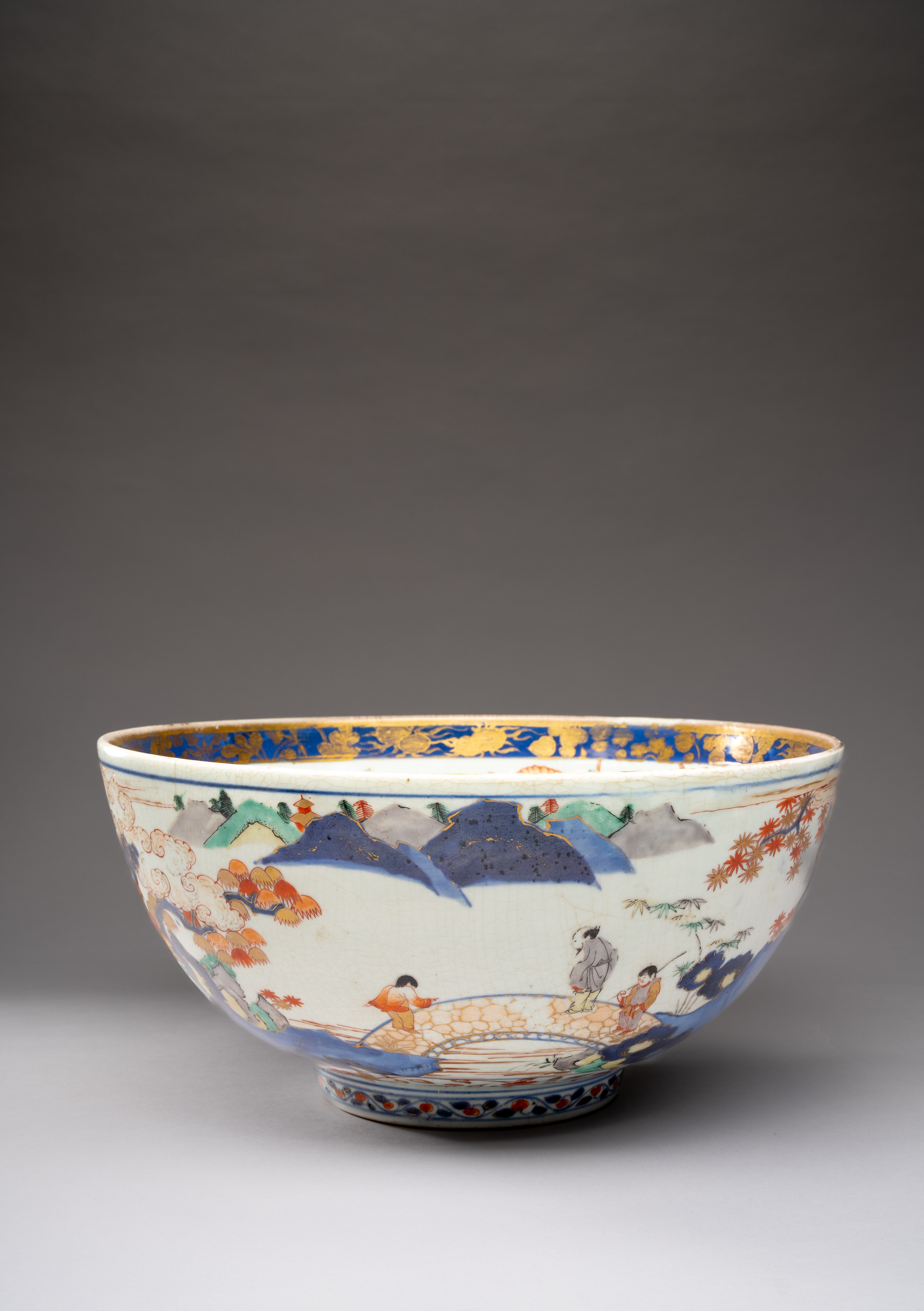 The deep body decorated in underglaze blue, gilt, yellow, red, orange, green and purple enamels, the well painted to the centre with a spray of peony and the cavetto with chrysanthemum tied up to bamboo canes, the rim with a band of clouds and fruiting branches in gilt on the dark blue ground; the reverse with a mountainous river landscape above two floral borders; an elderly man and two boy attendants crossing a bridge to one side, and a pavilion by a waterfall to the other, the base with a chrysanthemum mon, 37.7cm.