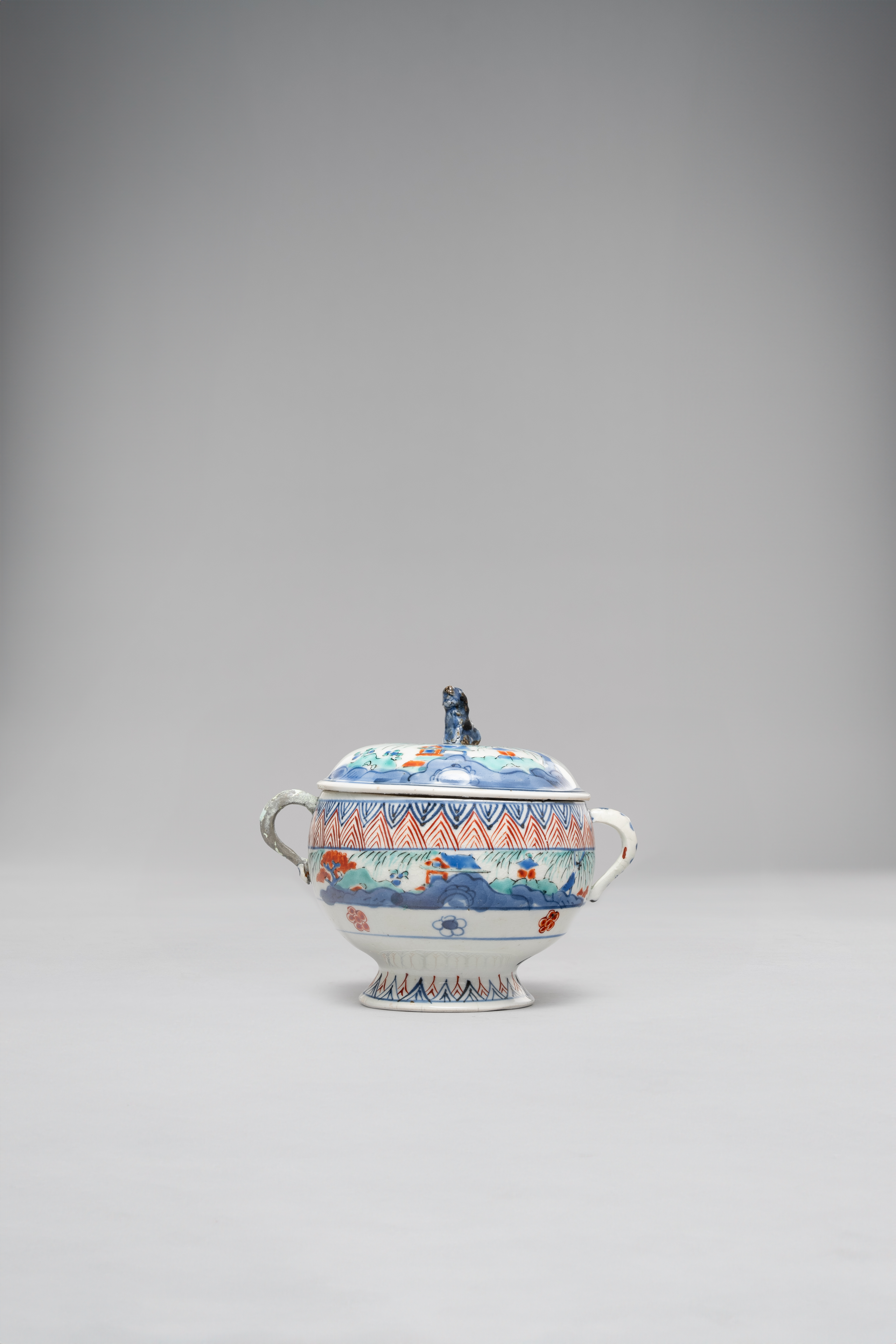 The bulbous body raised on a flared foot, with curved side handles and the cover topped with a seated shishi; decorated in underglaze blue and bright polychrome enamels with pavilions in landscapes, with large trees issuing from rockwork, in between borders of triangular lappets and flowerheads, 14.2cm. (2)