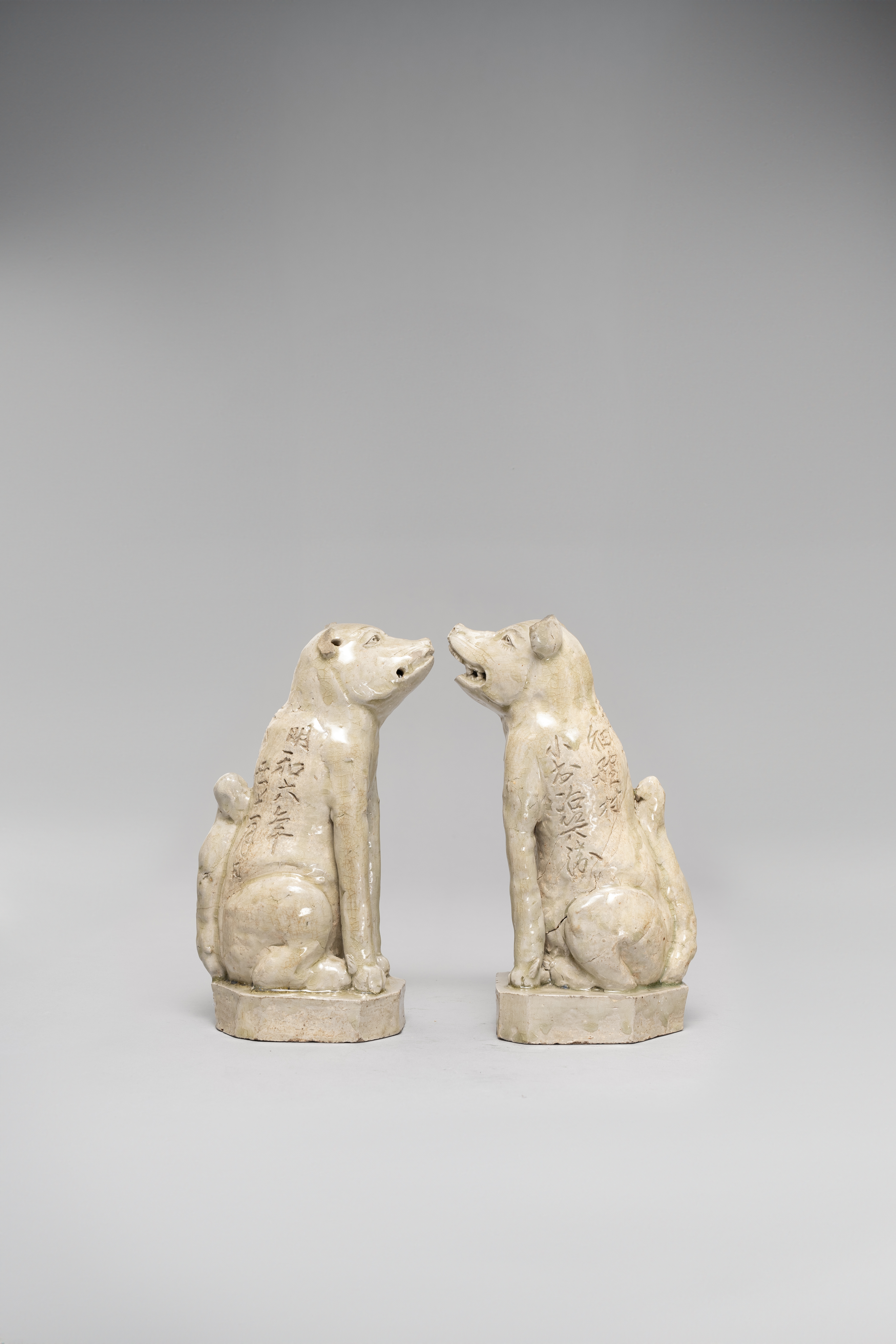 The two stylised animals modelled seated on their haunches, each raised on a polygonal base; the male depicted baring its teeth; each with the same long inscription incised on its back reading 'Hojo, Hosono mura, Komura Jihei, Meiwa rokunen, ushi, juichigatsu hi' (Votive dedication by Mr Komura Jihei of Hosono village, a day in the 11th month of the Year of Ox, in Meiwa 6th year -1769), both 26cm. (2)