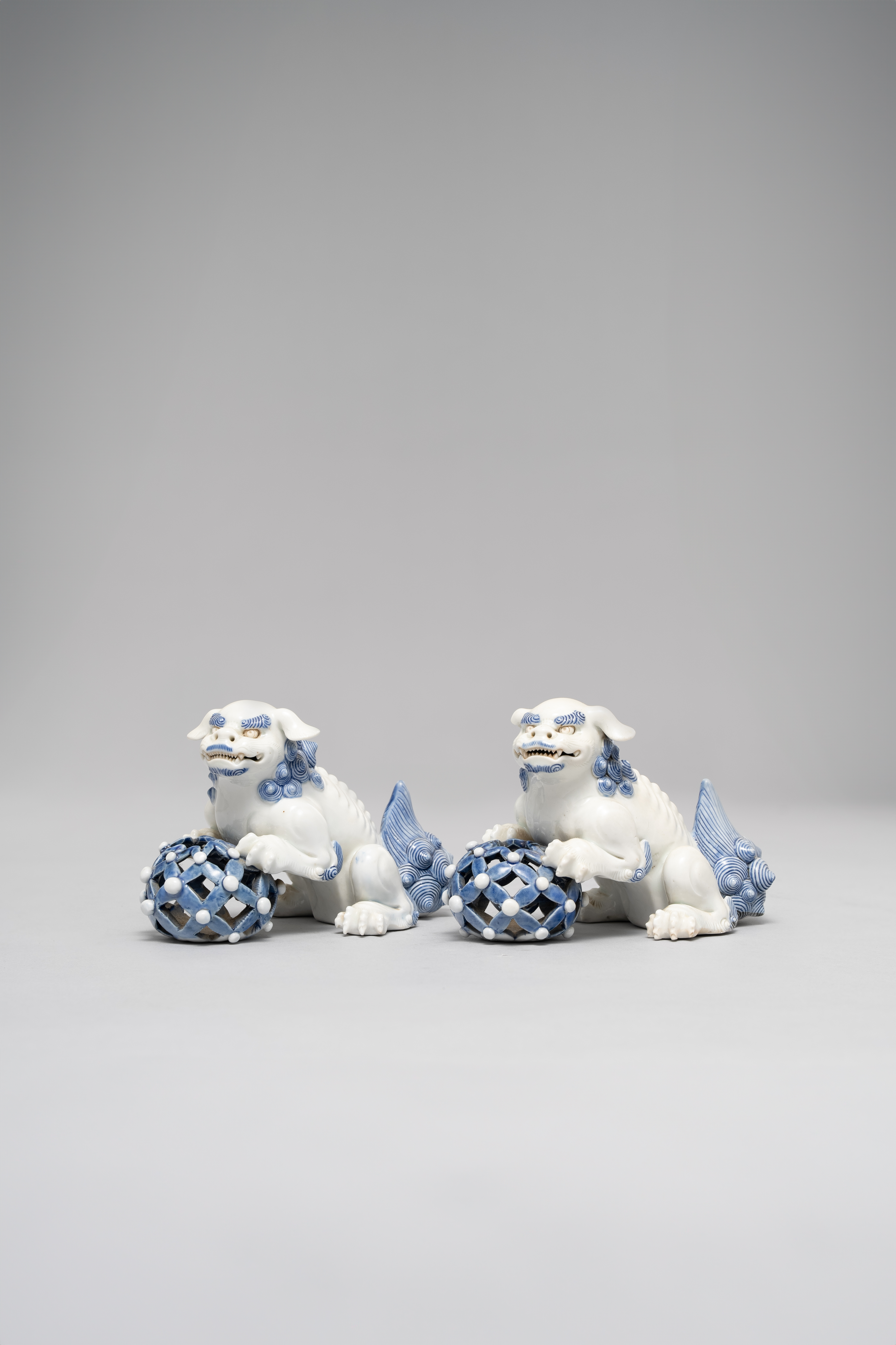 The lion dogs depicted baring their teeth, seated on their haunches with their paws resting on reticulated balls; their curled manes, tails, and other details picked out in underglaze blue, both 15cm. (2)