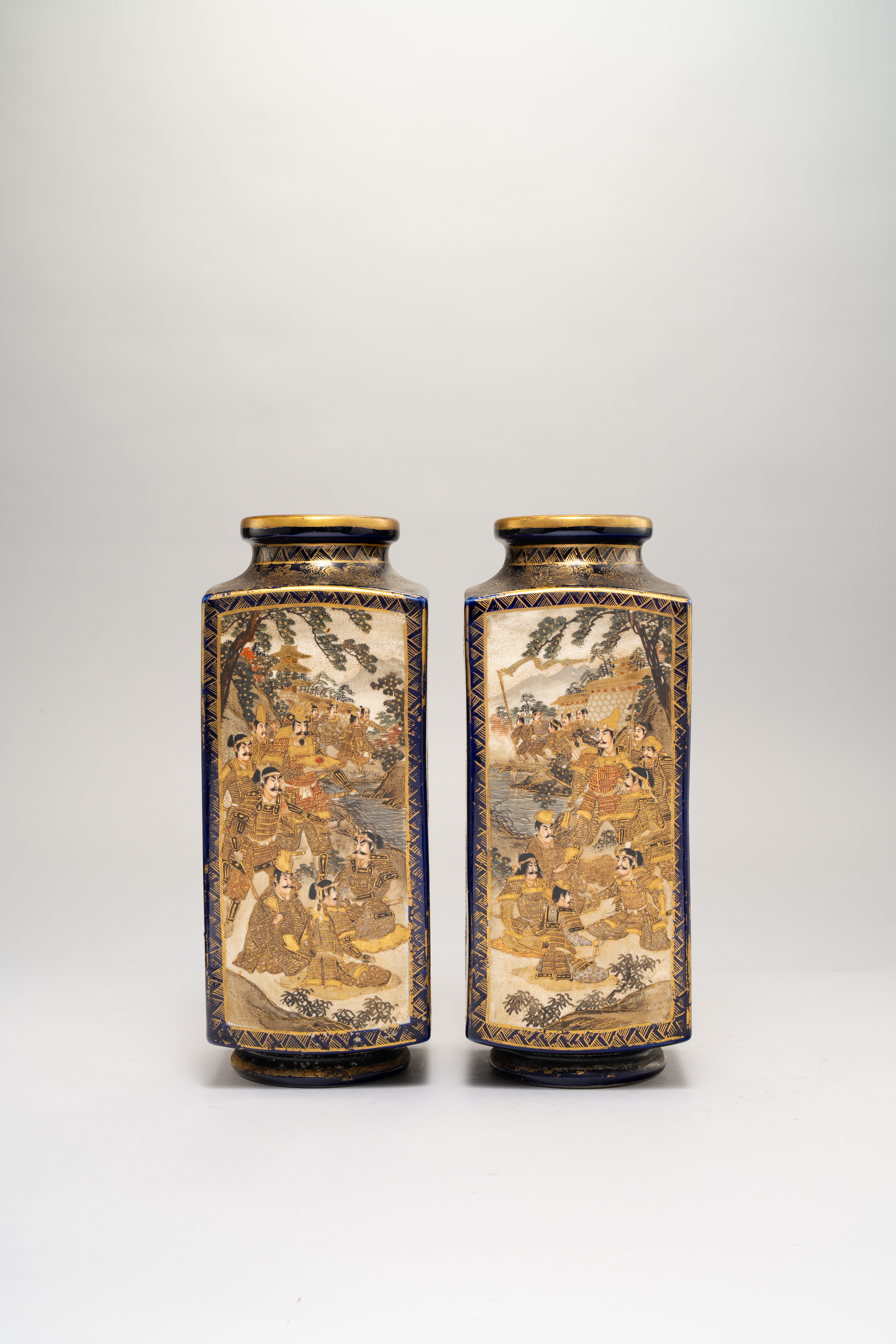 The tall square-section bodies each with a circular foot and rim; both decorated with rectangular panels enclosing many figures in interiors and in luxuriant gardens; framed by bands of chevrons and with a dense border of flowerheads to the shoulders; each vase signed Shozan zo under the Shimazu mon, both 25cm. (2)