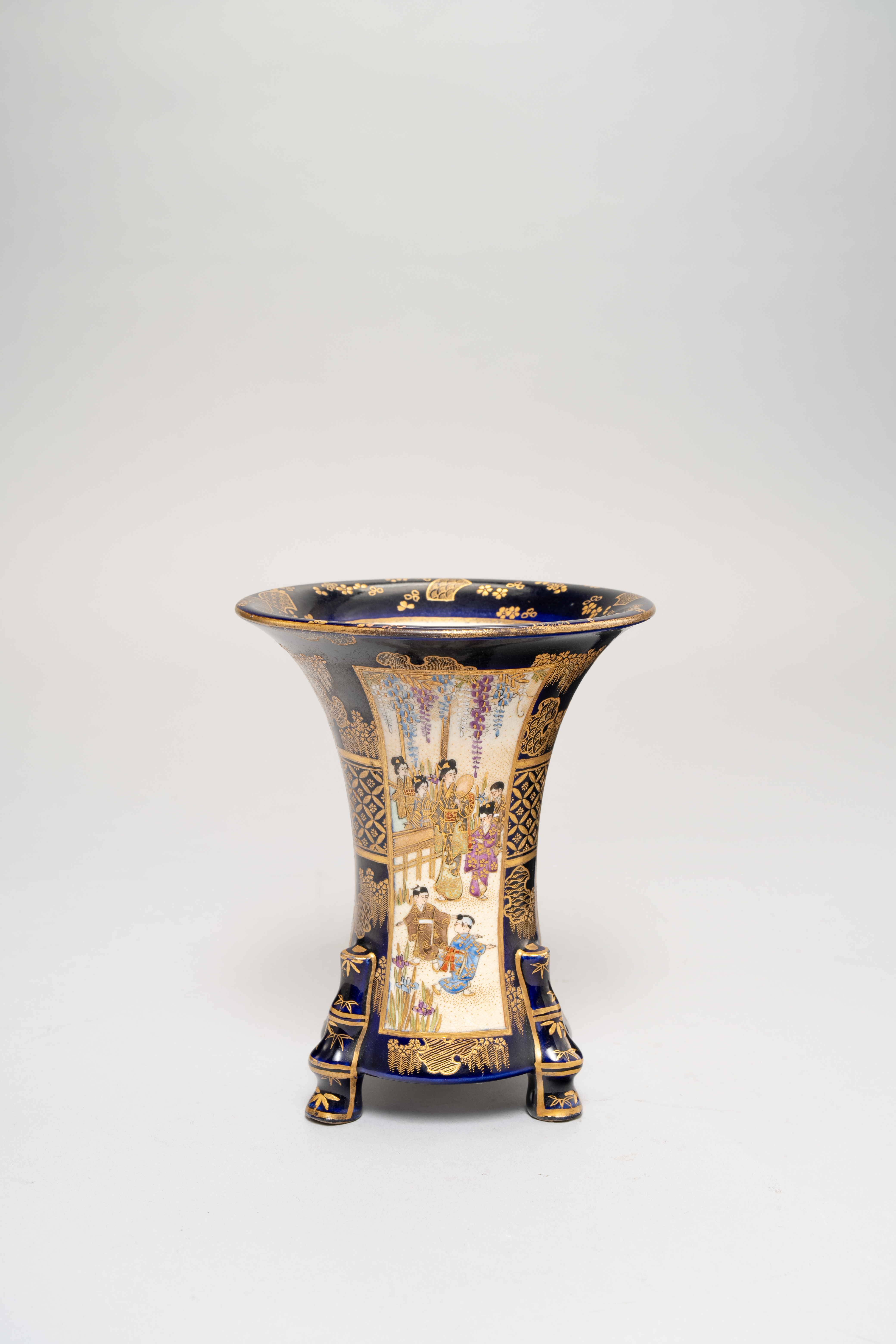 The tall body with a flared neck and raised on four bamboo-shaped legs, decorated with three rectangular panels enclosing figures in landscapes, one a small boy running whilst playing with his kite; on a dark-blue ground painted with flowers and brocade patterns in gilt, signed Gyokuzan zo under the Shimazu mon underneath, 15cm.