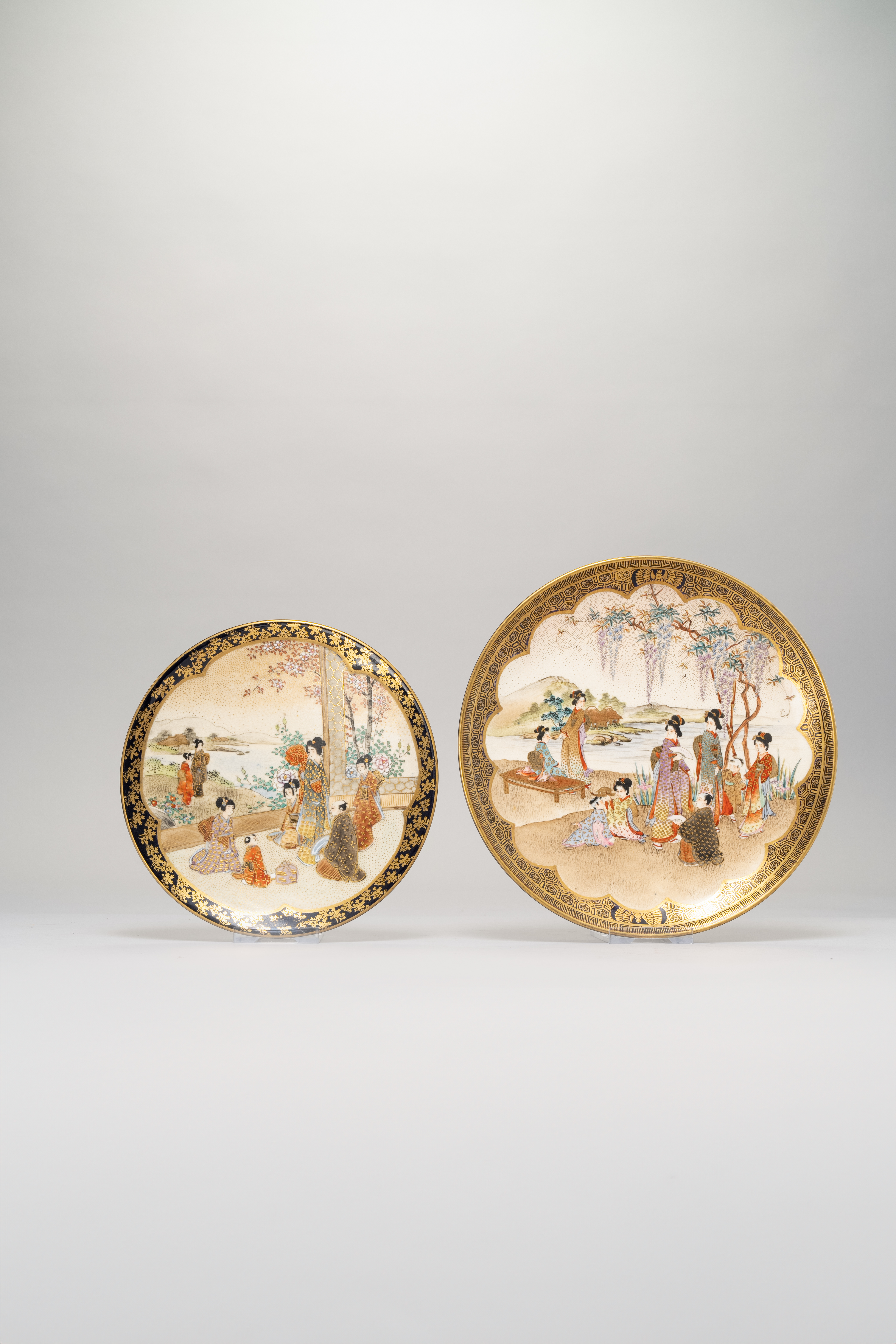 Both painted with figures, in an interior and in a garden by a lake; the largest dish with a border of cell diaper and stylised birds, the other with leafy foliage; the reverse of both dishes with a deep navy-blue ground, the largest signed Hozan and the other Hasegawa, 18.8cm and 15.5cm respectively. (2)
