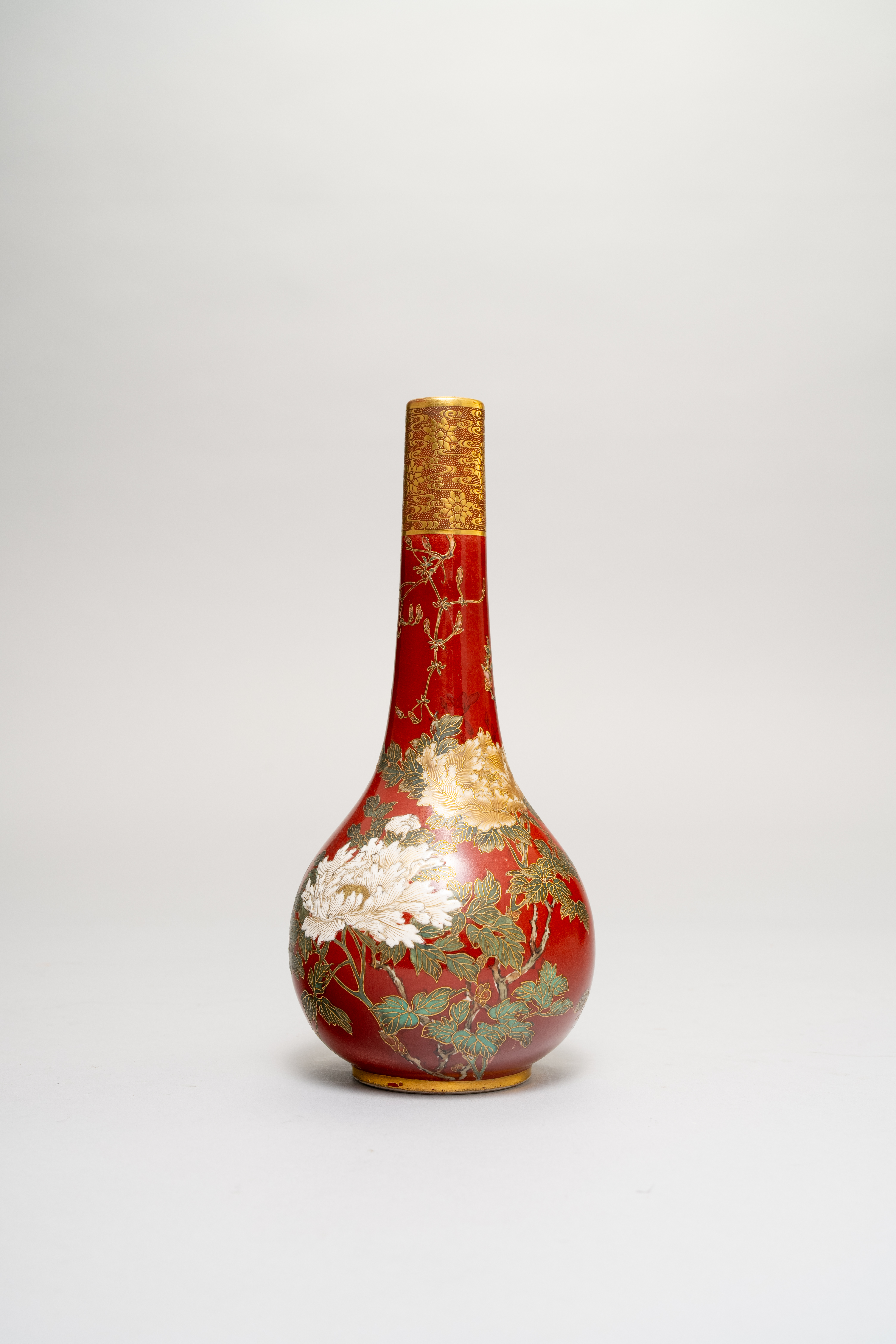The bulbous body raised on a short foot and with an elongated neck, elegantly decorated in gilt and polychrome enamels with large flowering sprays of chrysanthemum and peony on a coral-red ground; with a wide band of flowerheads amongst stylised waves below the rim; the base signed Seikozan, 18.5cm.