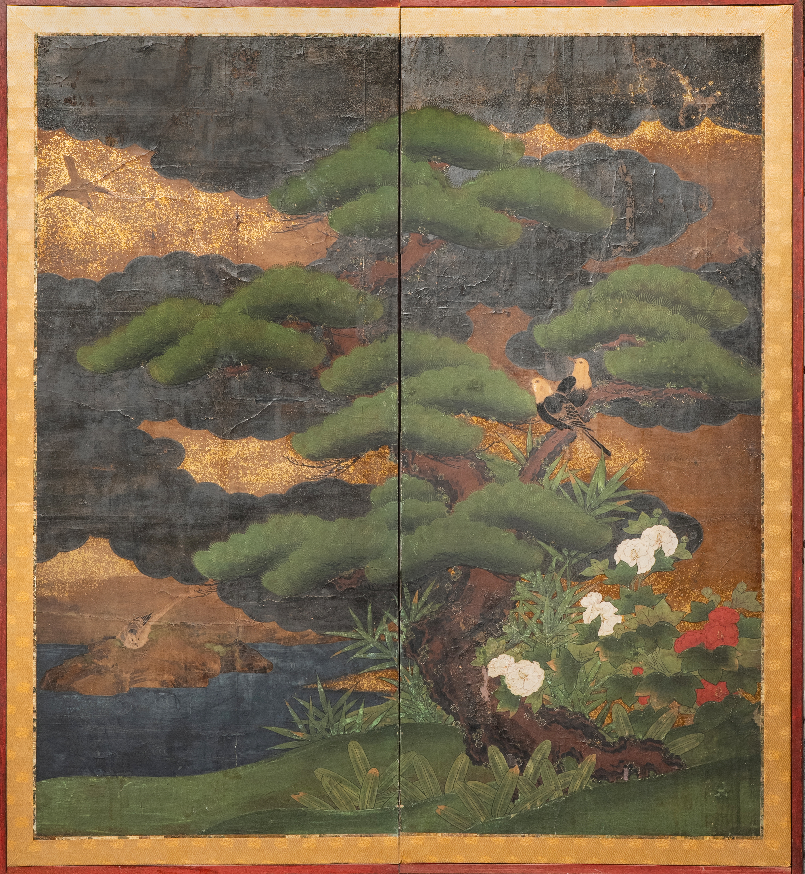 A Japanese two-fold byobu (paper screen), ink, colour and gold on paper, painted with birds in flight and perched amongst pine, bamboo and leafy peony sprays; a stream meandering behind them and with dark clouds above, 147cm x 134cm.