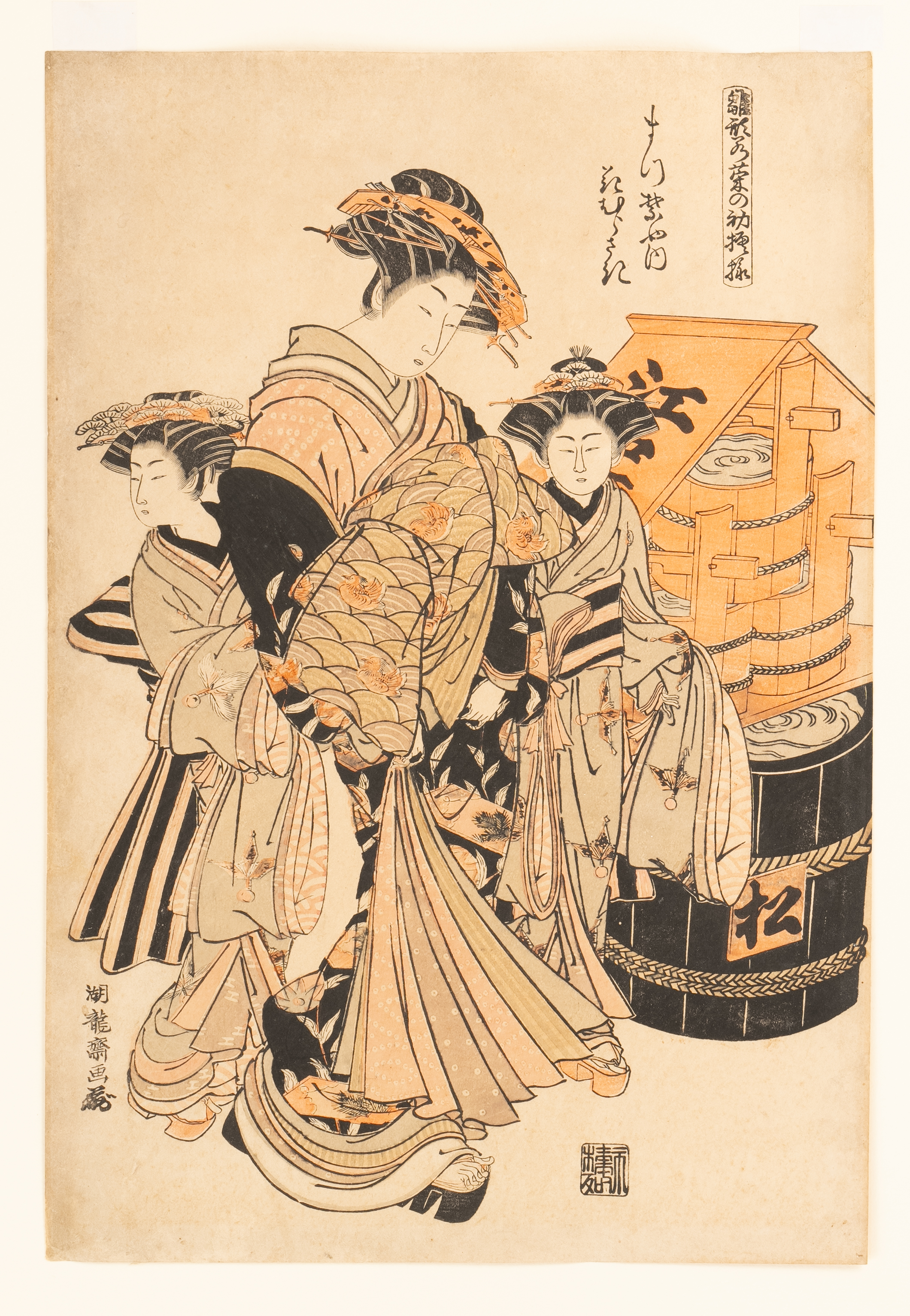 Two Japanese woodblock prints, the first by Koryusai depicting an oiran with two attendants, all three standing by a well, probably from the series Hinagata wakana no hatsu moyo (Models for Fashion: New Year Designs as Fresh as Young Leaves), signed Koryu ga and with kakihan, published by Nishimuraya Yohachi (Eijudo), c.1777, 38cm x 25.3cm; the other by Toyokuni depicting a Kabuki actor and an onnagata, signed Toyokuni ga, 37.4cm x 24.7cm. (2)
