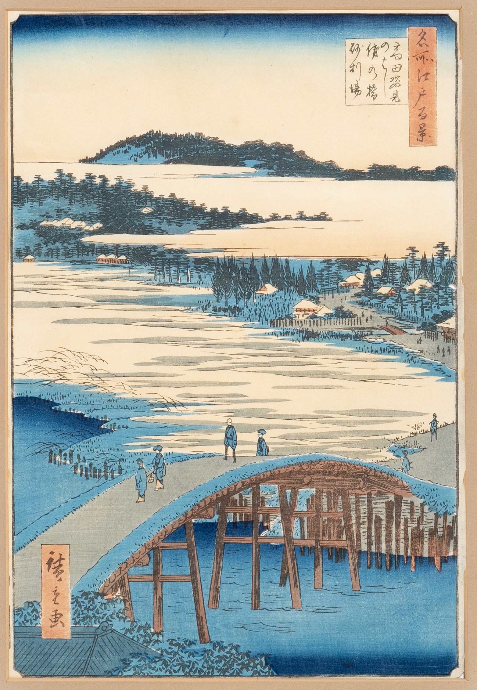 Two Japanese woodblock prints, the first entitled Mii banshô (Evening Bell at Mii-dera Temple), from the series Ômi hakkei (Eight Views of Ômi), signed Hiroshige ga, with censor's seal aratame, 'Snake 3', 37.3cm x 25.2cm; the other entitled Takata Sugataminohashi Omokagenohashi jariba (Sugatami Bridge, Omokage Bridge, Jariba at Takata), from the series Meisho Edo hyakkei (One Hundred Famous Views of Edo), also signed Hiroshige ga, 35.8cm x 23.4cm.