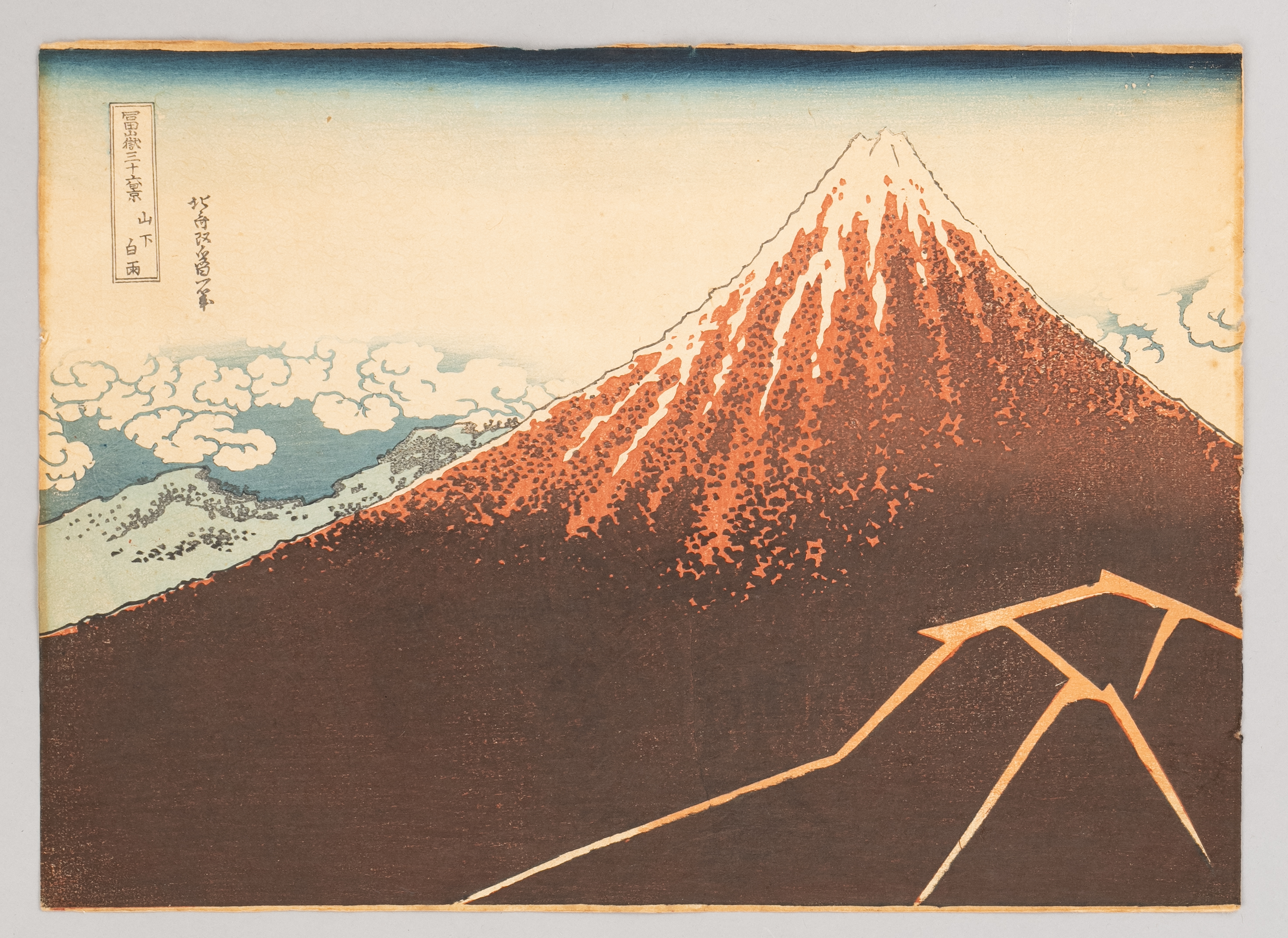 A Japanese woodblock print, entitled Sanka no haku u, also known as 'Black Fuji', from the series Fugaku sanjūrokkei (Thirty-six Views of Mount Fuji), signed Hokusai aratame Iitsu hitsu, published by Nishimuraya Yohachi (Eijudo), oban yoko-e, 25.5cm x 36.8cm.