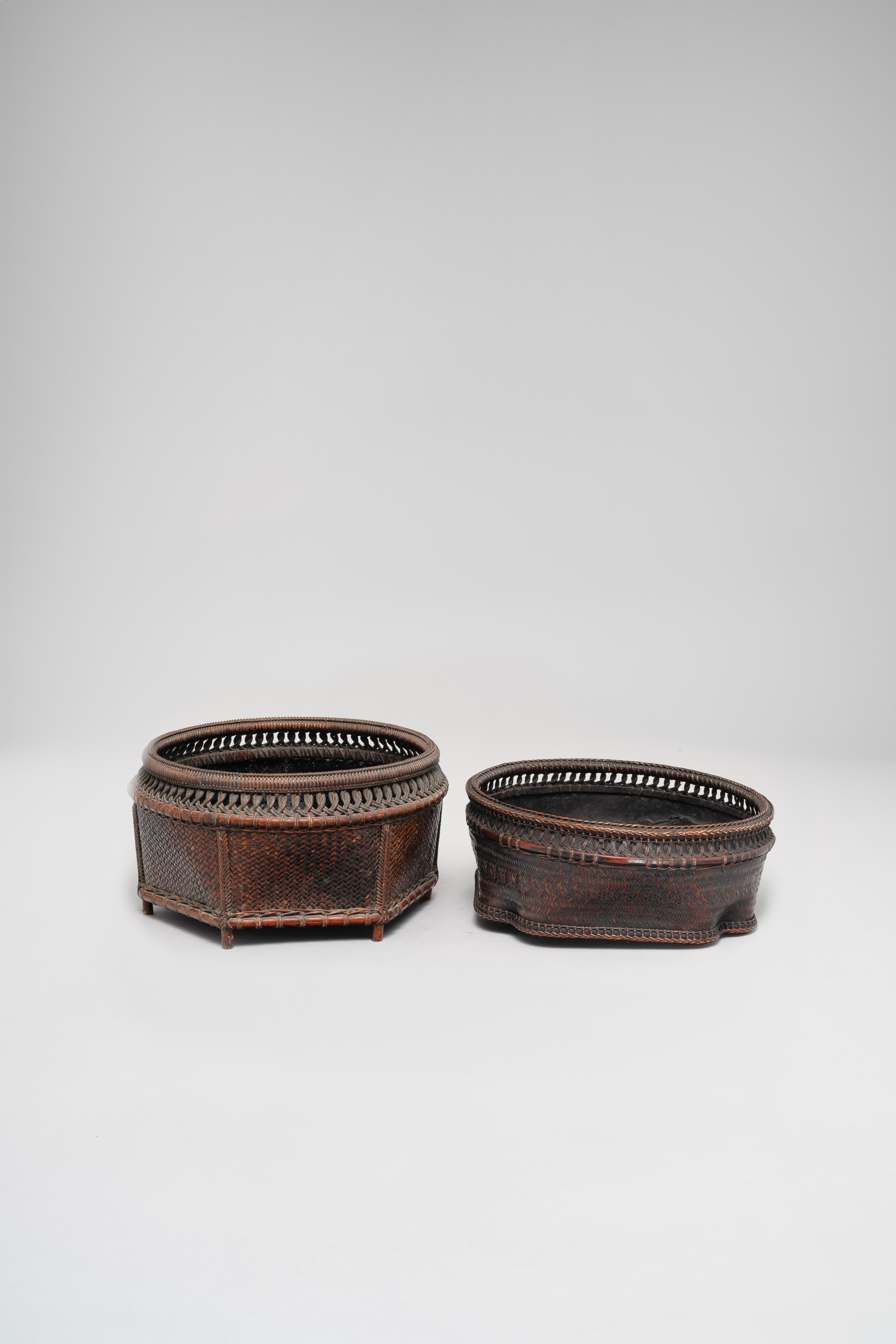 The Chinese-style baskets for the sencha tea ceremony, one with a cross-shaped base and a wide circular mouth, the other with a hexagonal body and raised on short feet, the bamboo strips woven in a variety of techniques to produces diverse patterns, 25cm and 22.5cm respectively; each with a tomobako wood box. (4)