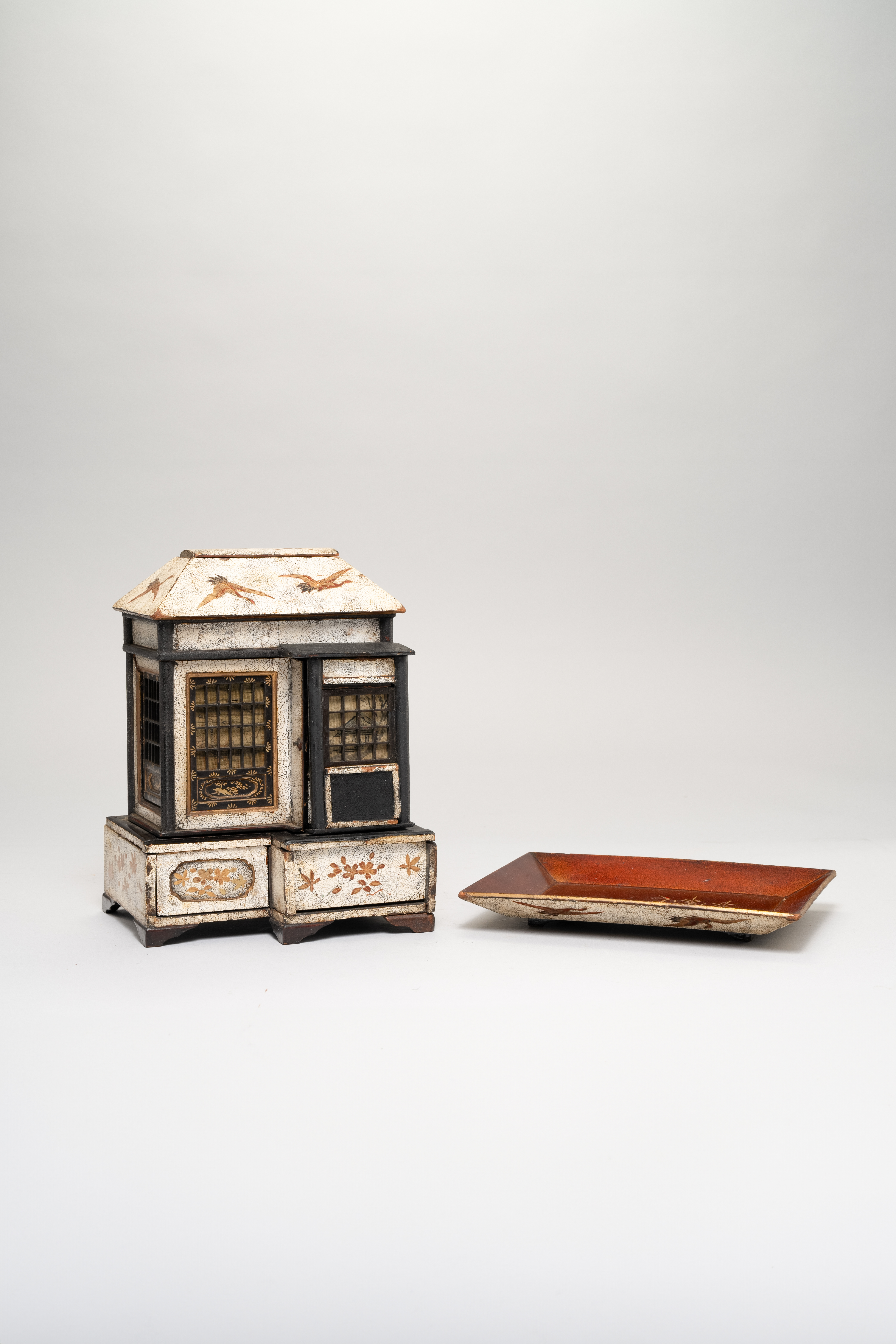 Shaped as a pavilion and decorated with many cranes in flight on the white eggshell ground, the walls opening to reveal many boxes decorated with chickens and further cranes, some in tsugaru lacquer, 20.5cm x 12.2cm x 16cm. (a lot)