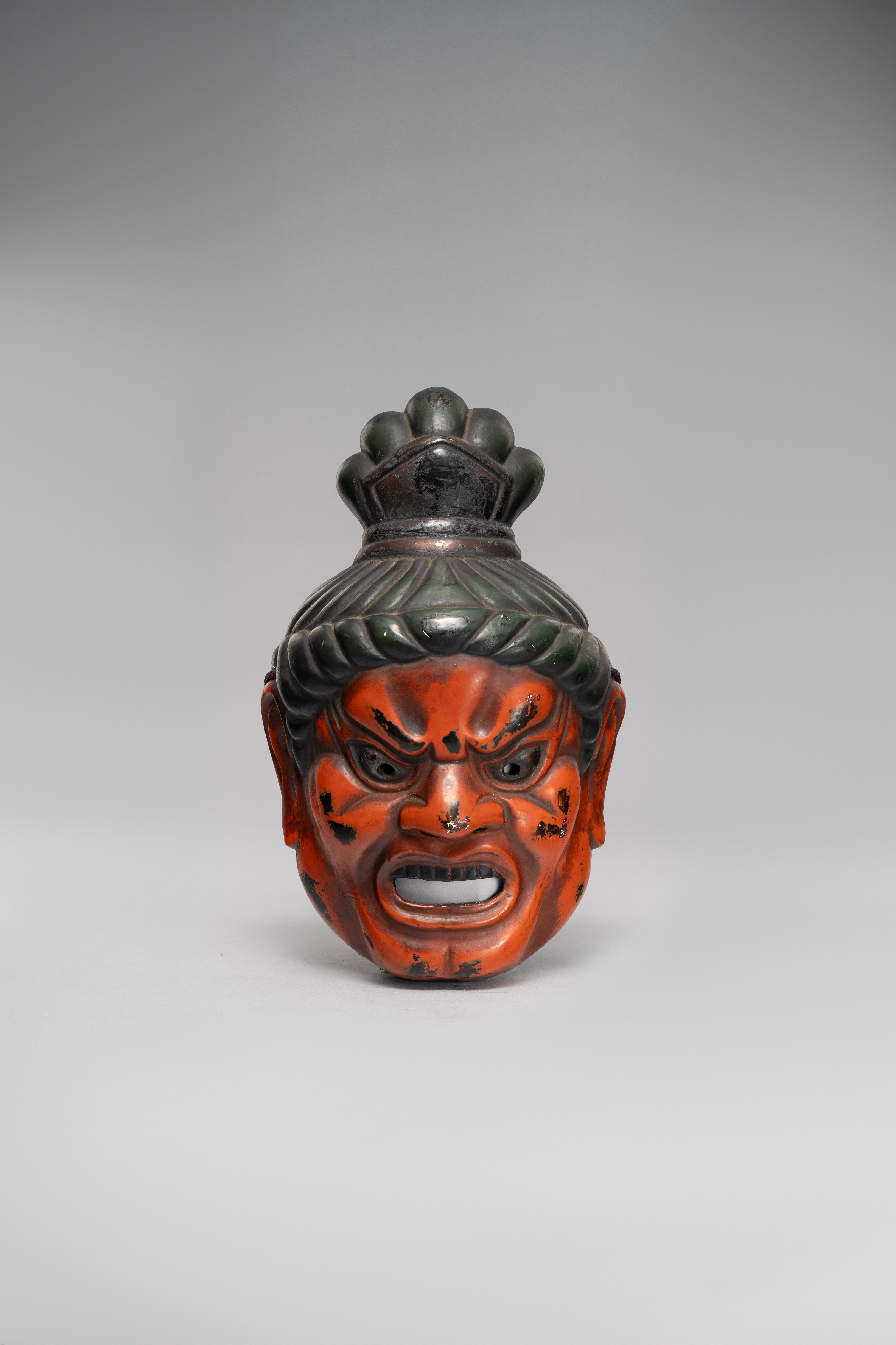 The Buddhist Guardian God depicted with a ferocious expression, the skin rendered in red and black negoro lacquer, the eyes and crown with remnants of silver-colour pigment and the hair a dark green; 37cm.