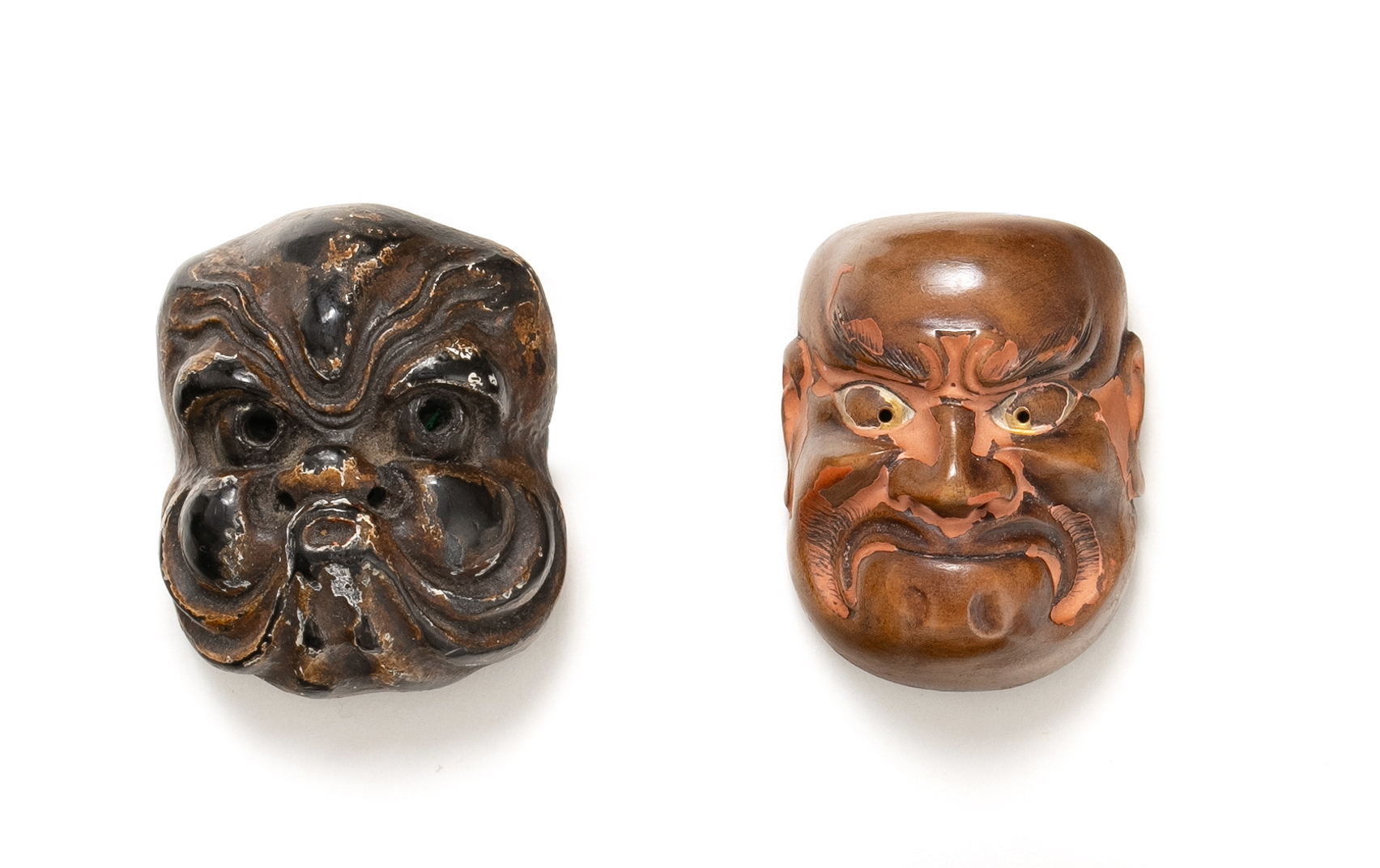 The first carved as a miniature noh mask of Ko-Beshimi, the male face with tight lips and a furrowed brow, with traces of lacquer and gilt to the eyes, the reverse signed Tenjo; the other depicting an octopus-like face, also with remnants of lacquer; 4.5cm and 4.6cm respectively. (2)