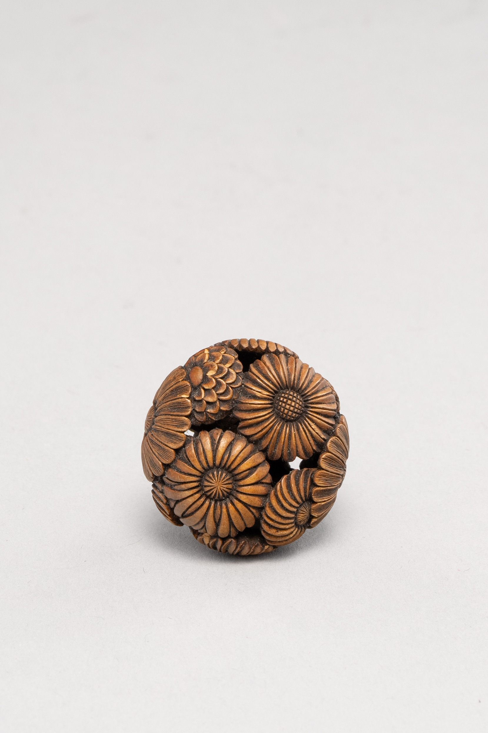 The surface decorated in openwork with chrysanthemum, daisies and other flowers crisply carved, a metal ring at the back for suspension, 3.3cm.