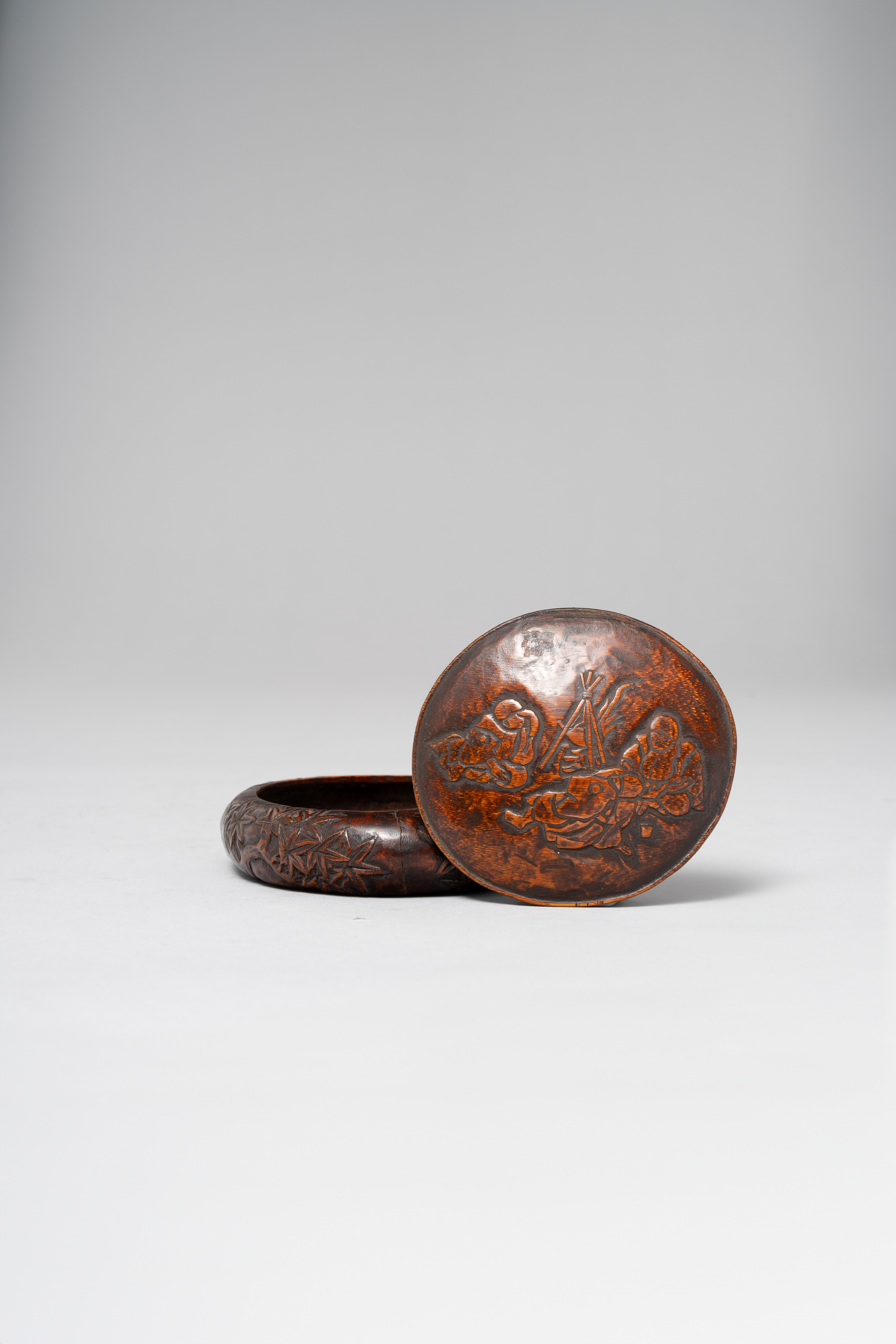 Of circular form, the cover carved with figures beside a camp fire, the reverse with a spray of reishi fungi; the sides and base with maple leaves, 12cm. (2)