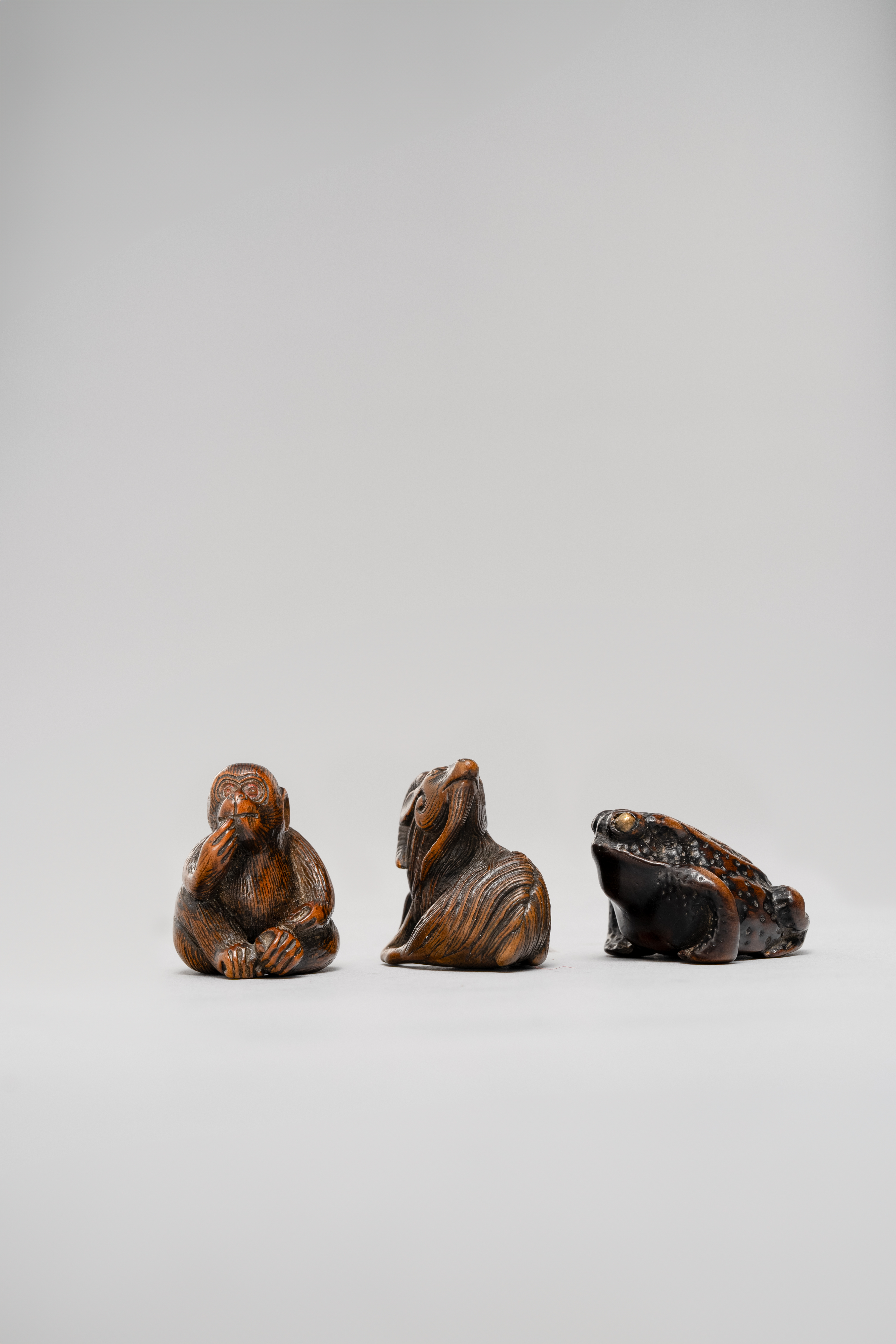 One carved as a large frog, its eyes inlaid with metal studs, signed underneath; another a seated monkey scratching its mouth in a quizzical manner; the third depicting a recumbent ram with its head turned towards its back, its large horns curling behind its ears, 4.4cm max. (3)