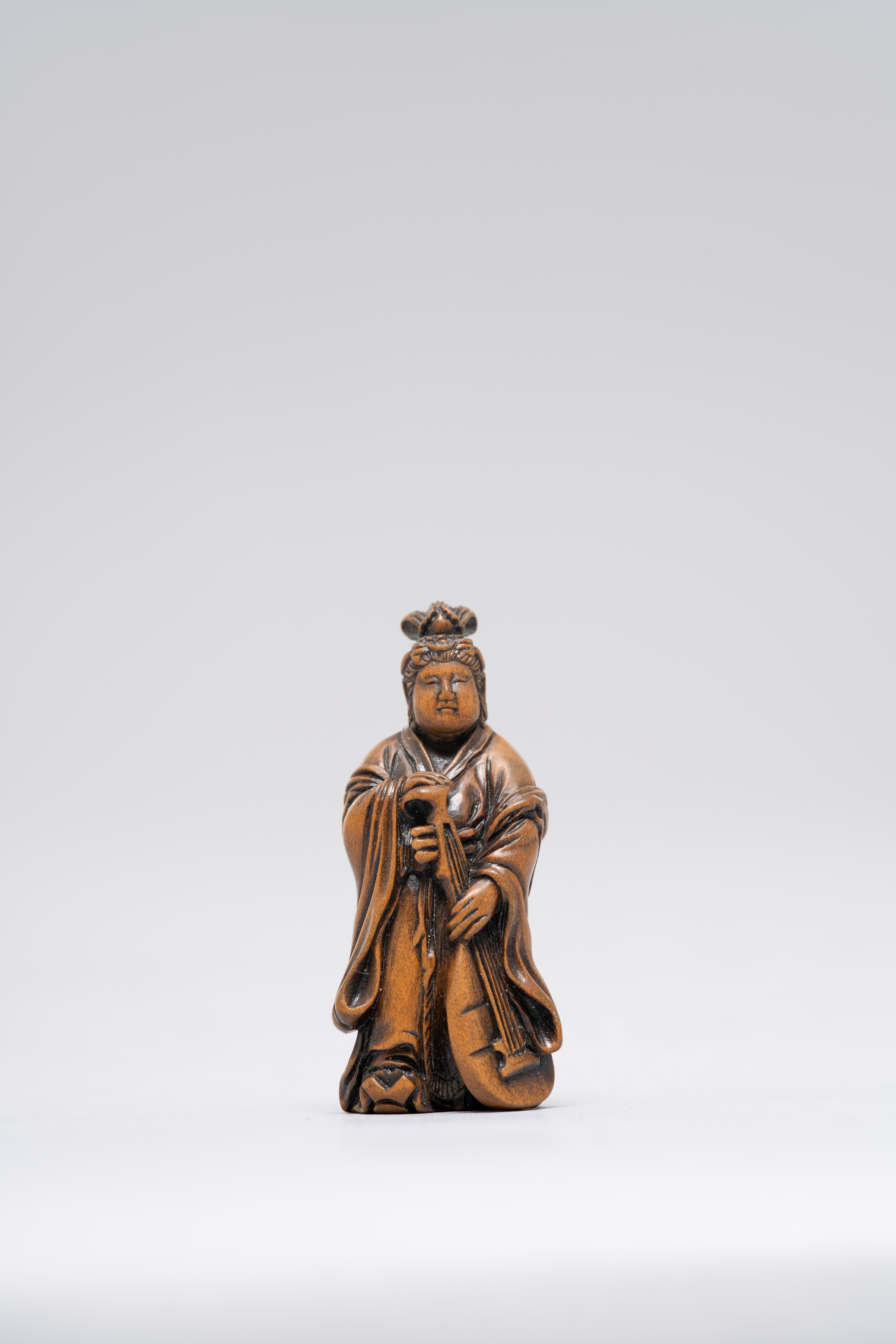 A MINIATURE WOOD NETSUKE OF BENTEN