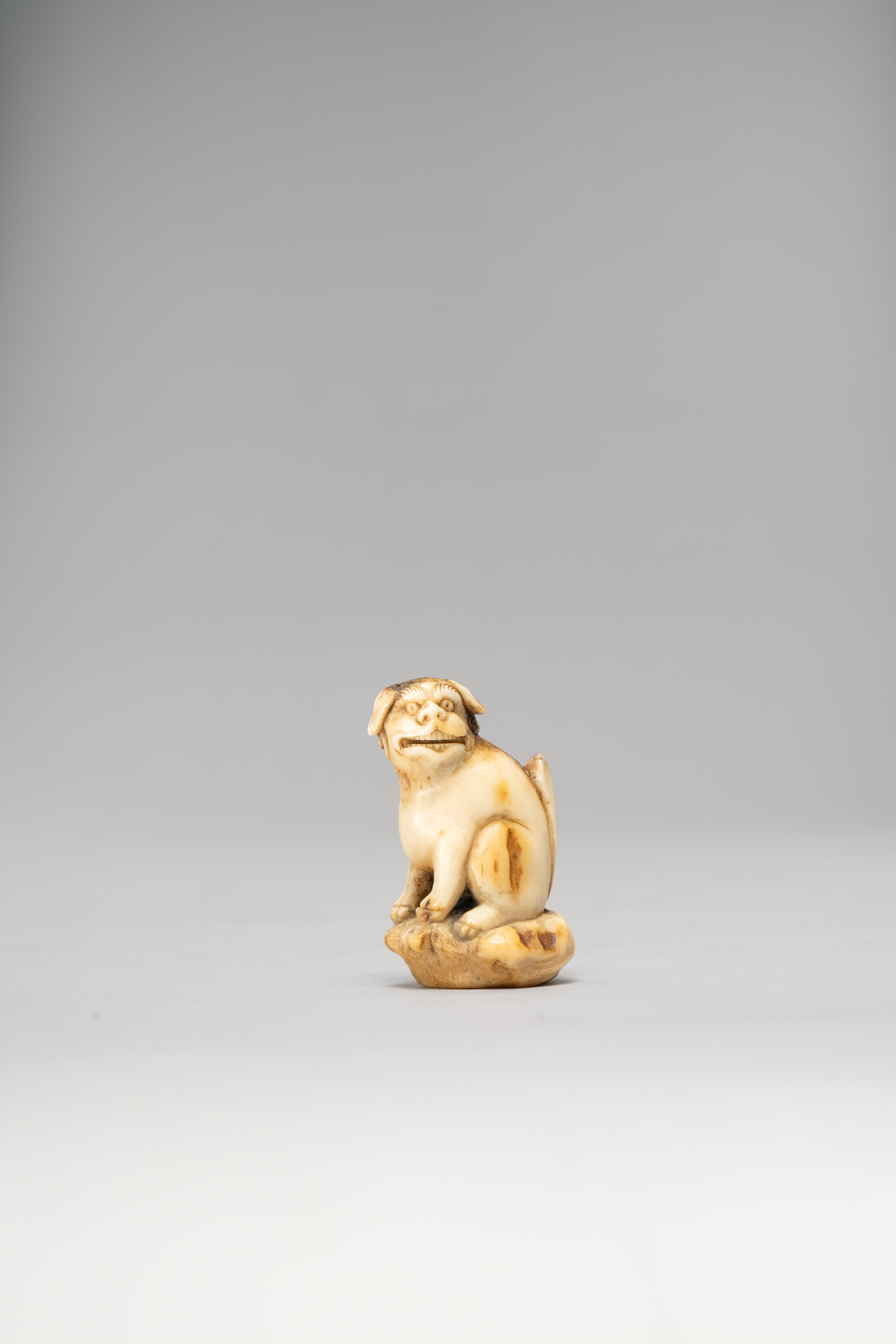 The lion dog is depicted seated on a rocky outcrop, baring its teeth and with its head turned to the side; its fox-like tail raised against its back and its mane curling behind the ears, 4.5cm.