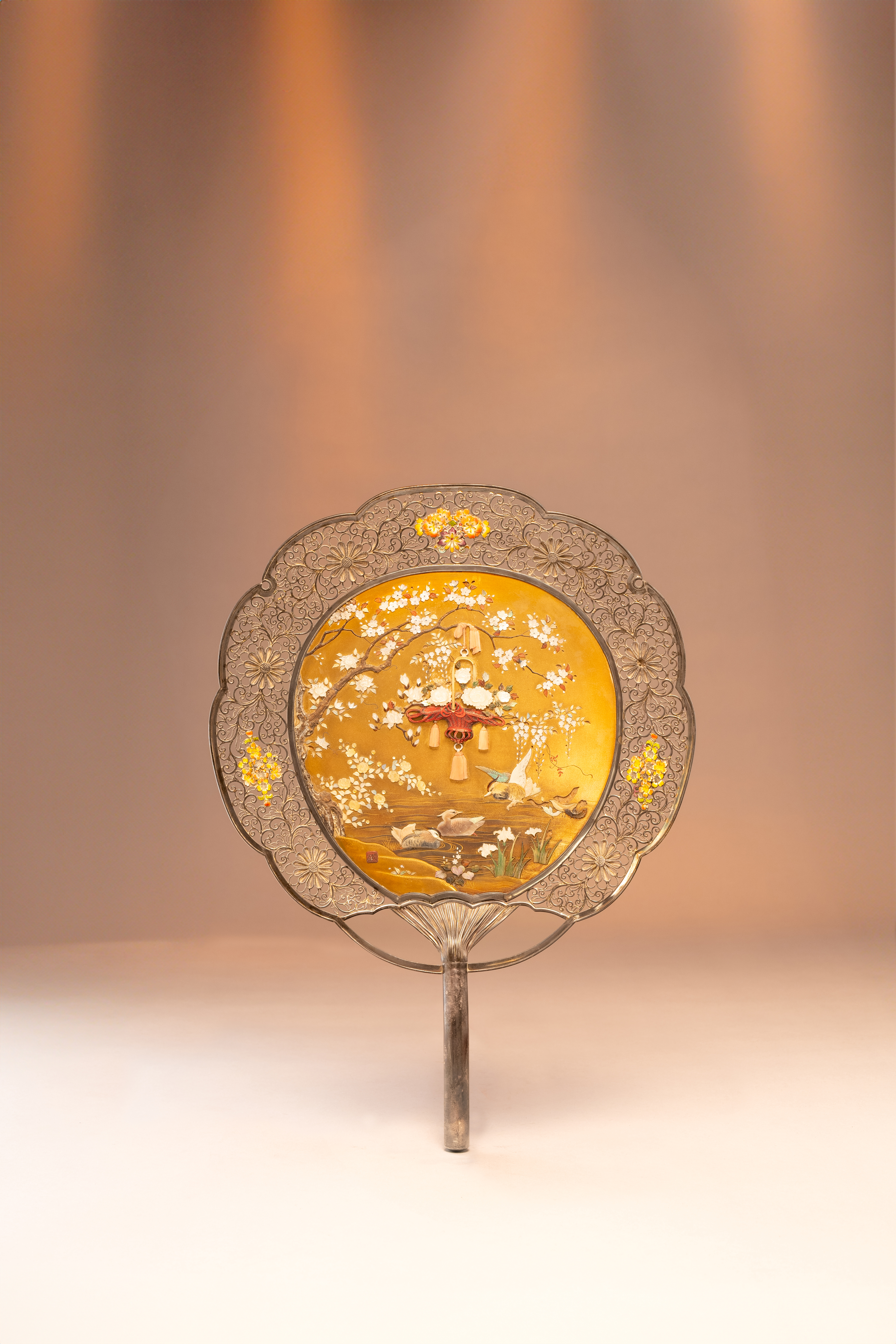 The central panel richly embellished with mother of pearl, coral and other inlays on a kinji gold-lacquer ground, mounted on a silver filigrée frame with a straight handle; decorated with mandarin ducks on a river beneath flowering branches of prunus from which hangs a large basket with tassels, containing chrysanthemum, peony, wisteria and other blooms; a square tablet inscribed Masayuki lower left corner; all framed by a border of chrysanthemum flowerheads and scrolling tendrils, with further blooms enamelled in polychrome, 38.3cm.