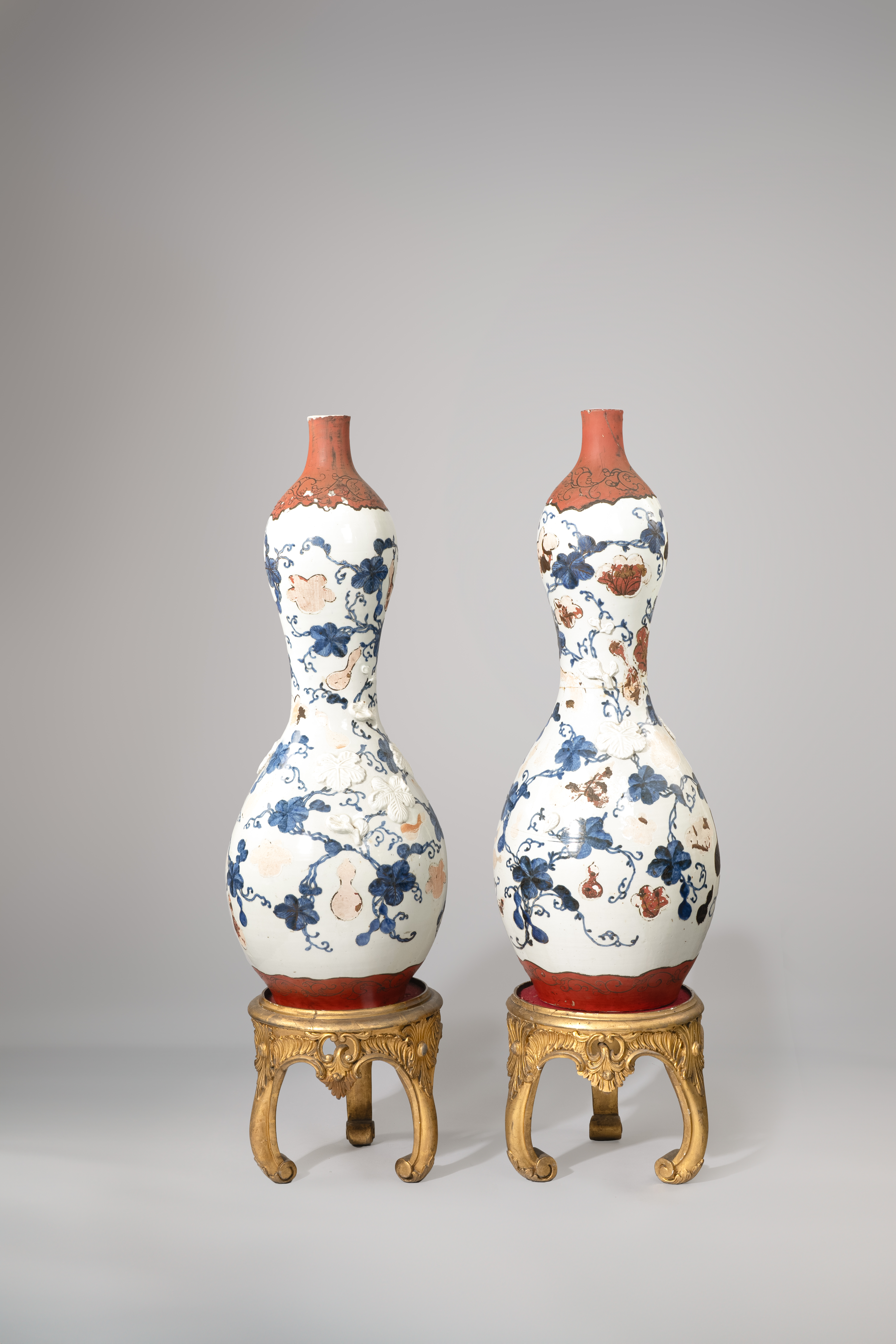Both vases with a tall, elongated pear-shaped body; decorated in underglaze blue with leafy scrolling tendrils and double-gourds, the same motifs repeated in low relief; each vase with iron-red lacquer and gilt bands of curling patterns to the rim and above the foot, and with further traces of lacquer decoration; both raised on European gilded stands, the vases 98cm. (4)