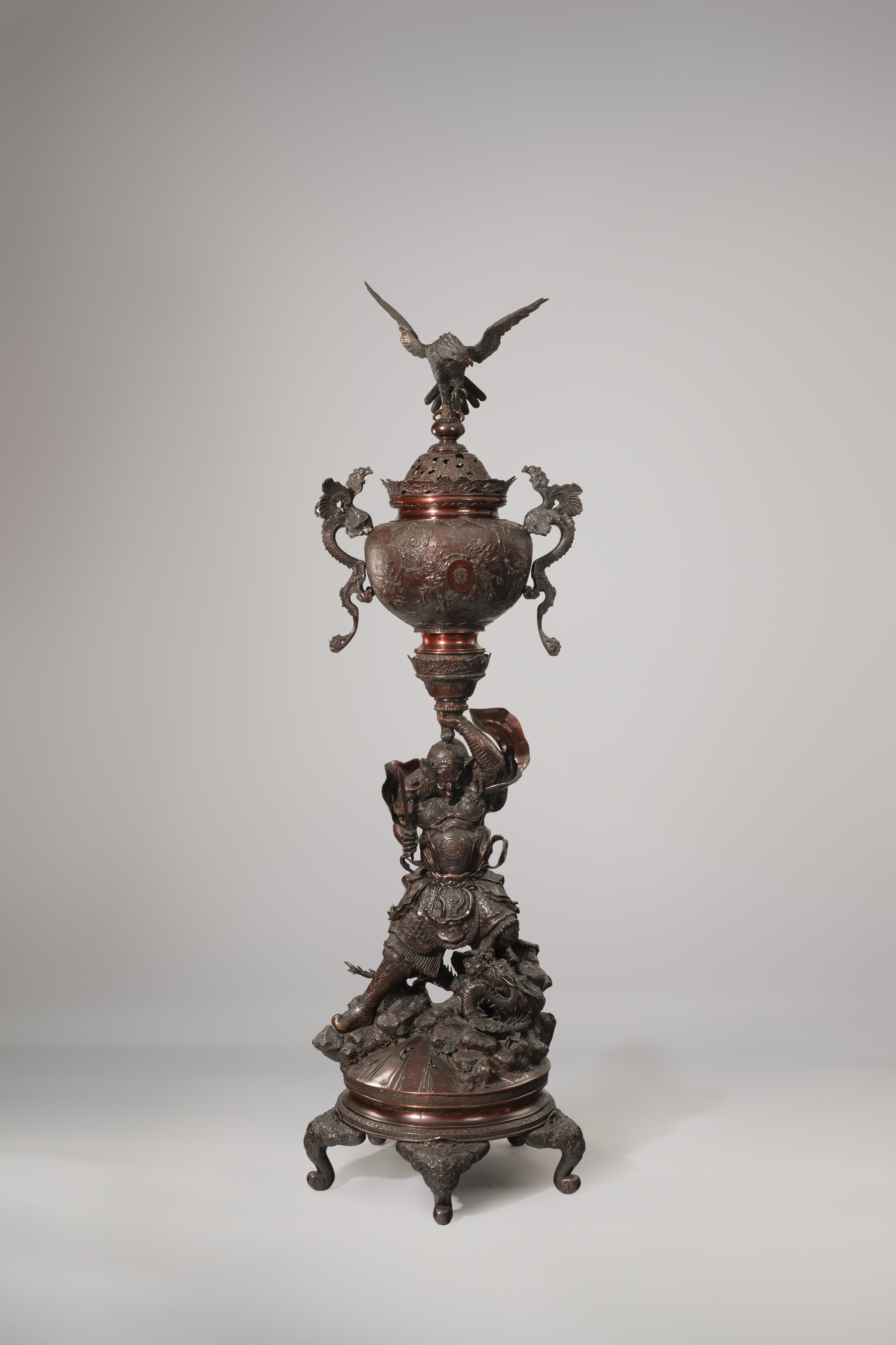 Raised on five scrolling feet, the lower section cast in high relief as Bishamonten slaying a dragon, the God wearing elaborate armour and holding up his sword, ready to strike; he carries a large bulbous vase above his head with his other hand; the handles are modelled as winged mythical creatures, the sides decorated with a procession of oni, bats, and other bakemono, two monsters carrying a large drum; the cover powerfully cast as an eagle on a rock with outstretched wings; 182cm overall.