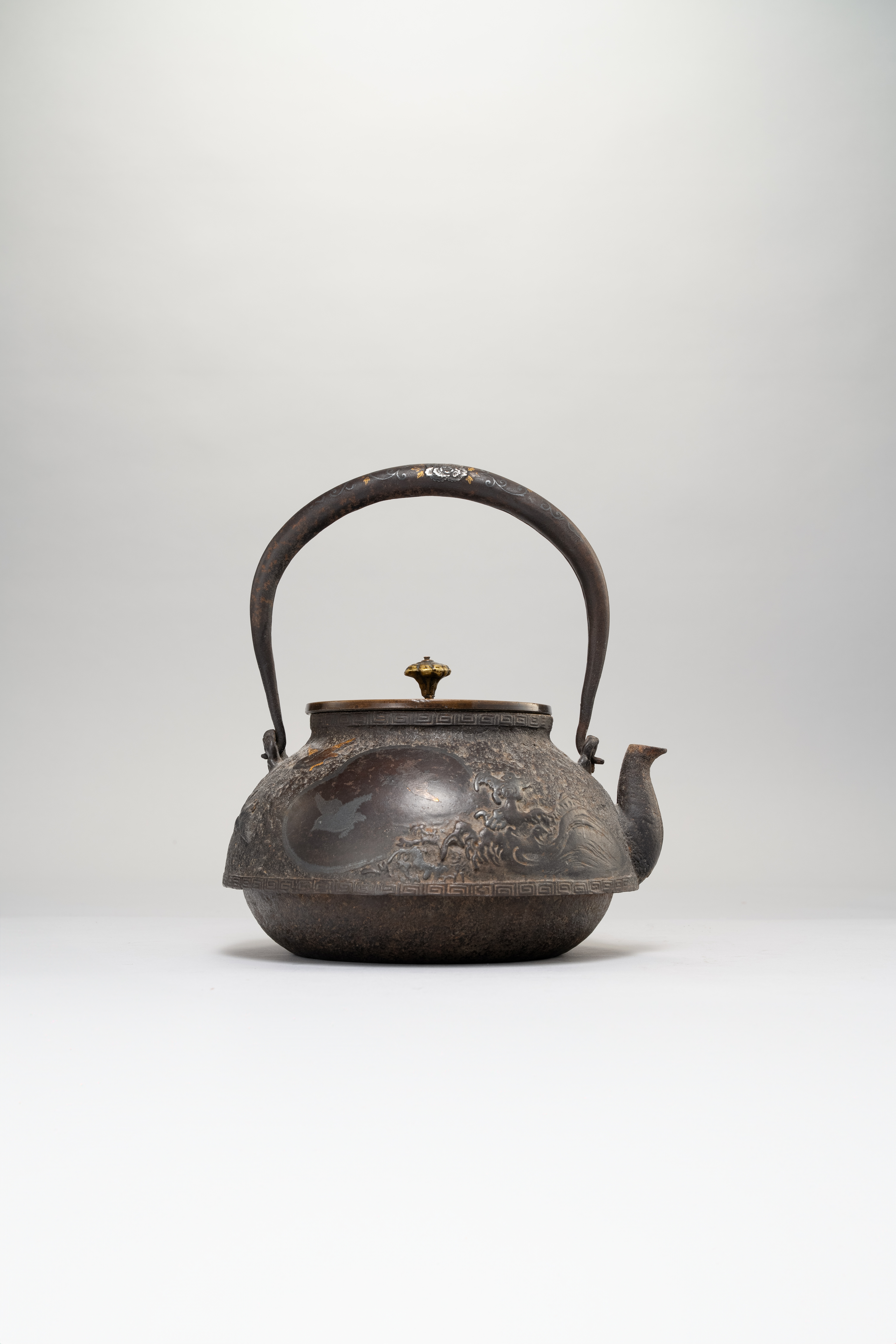 A JAPANESE INLAID CAST-IRON TETSUBIN (TEA KETTLE) AND COVER BY THE SEIJUDO COMPANY