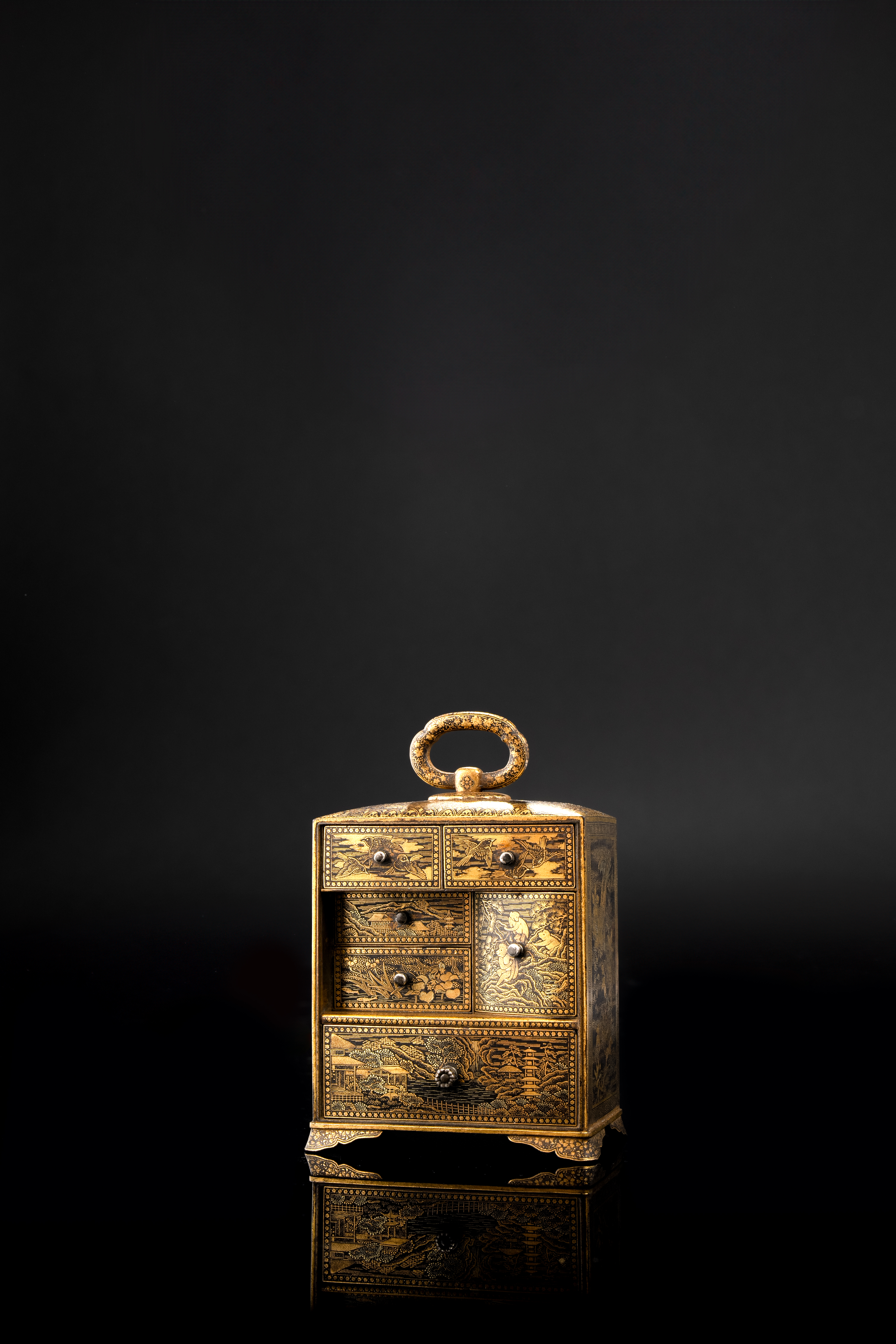 The slightly-domed rectangular body raised on four bracket feet and with a loop handle to the top, with six variously-shaped drawers, one with a curved front, all with a silver-coloured pull handle; the cabinet is decorated all over with dense designs of birds, flowers, mon, monkeys, landscapes and brocade patterns; one cartouche with a shrine resembling Kiyomizu-dera in Kyoto; the sides with two large panels enclosing a pheasant perched on a flowering branch of peony to one side, and a butterfly fluttering above chrysanthemum to the other; the back of the cabinet with a complex scene of worshippers climbing steps leading to a shrine, the pavilion nestled amongst the trees; with seated lion dogs either side of the entrance and a sign inscribed Naritasan Fudoson below; the base with a square seal mark reading Nihon kuni Kyoto ju Komai sei, 12.2cm x 8.3cm x 5.4cm. (7)