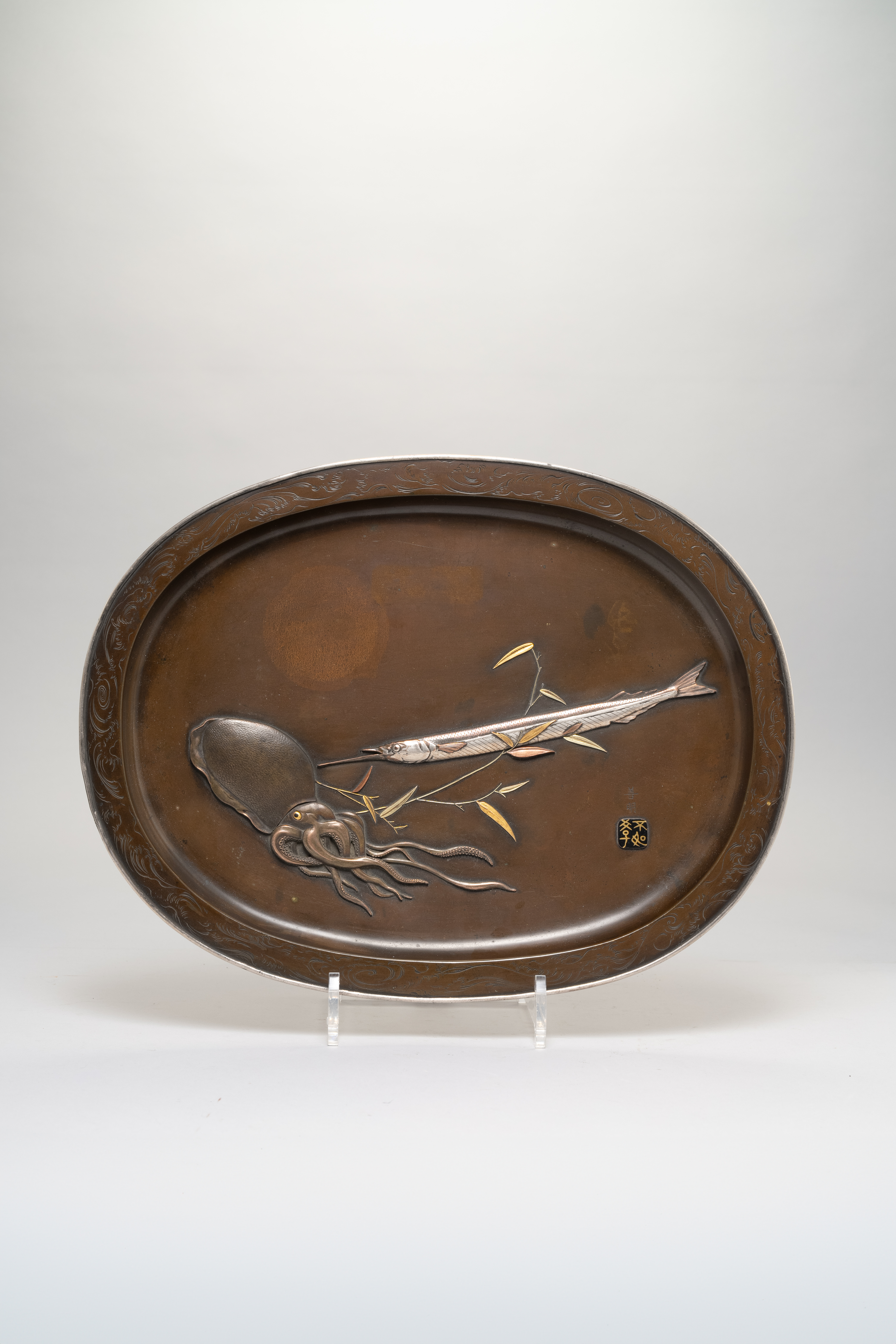 Decorated with an octopus, a sayori (Japanese halfbeak), and a twig of bamboo, realistically modelled in relief and rendered in silver, copper and gold on the oval bronze body; the rim engraved with a band of crashing waves; signed lower right corner with the incised characters for Yoshiaki and an inlaid shakudo seal, 35.2cm x 27cm.