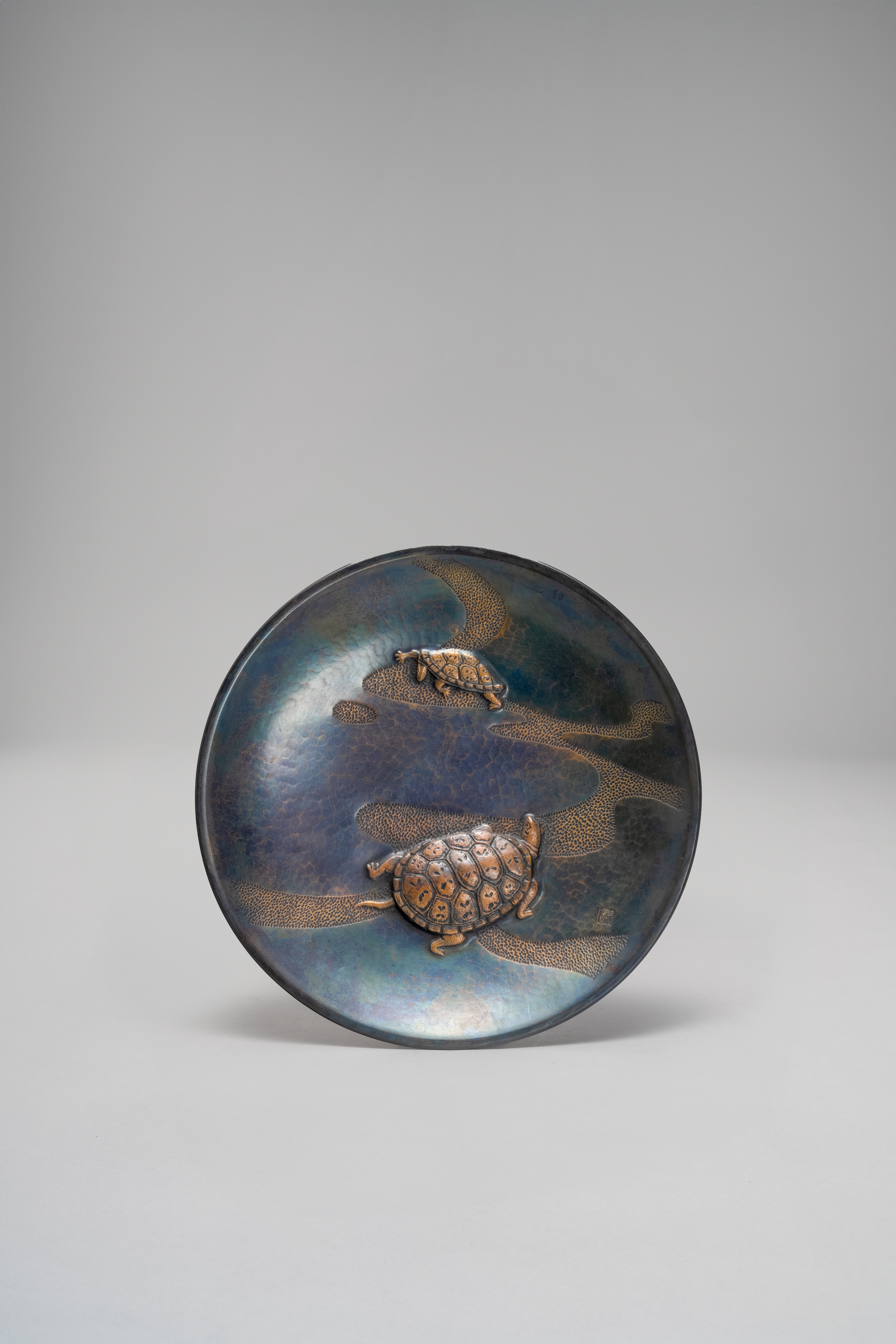 Decorated with two large turtles amongst waves, the animals gilded on the bluish hammered ground, with a seal mark lower right for Gyokusendo, 29.3cm; together with an inscribed tomobako wood box. (2)