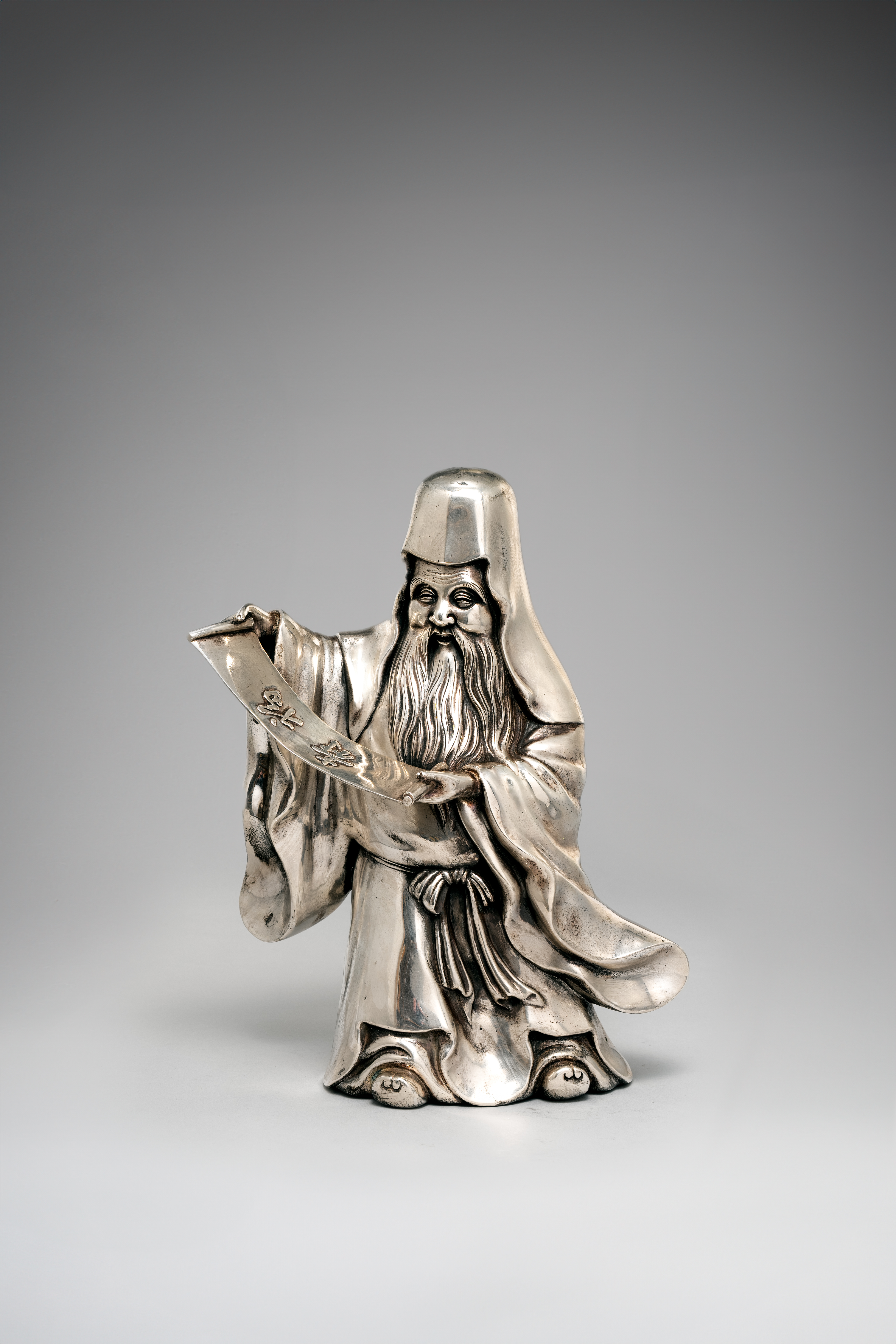 A LARGE JAPANESE SILVERED BRONZE FIGURE OF JUROJIN BY OSHIMA JOUN (1858-1940)
