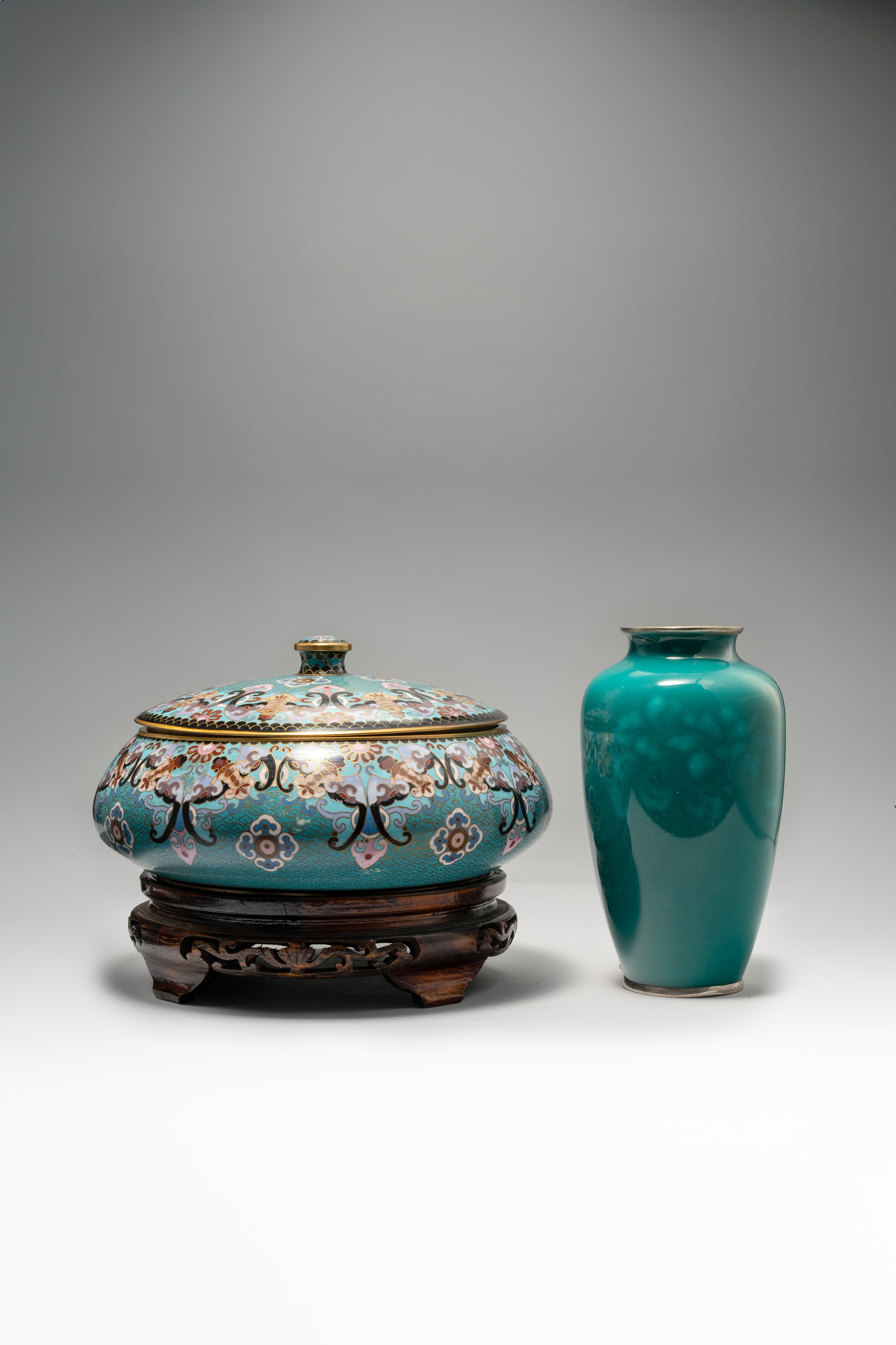 The tall baluster body decorated in bright emerald-green shizumi enamels with a band of flowers and leaves, the foot and neck both with white metal mounts; together with a Chinese circular cloisonné box and cover with bats and floral patterns, raised on a wood stand, 24cm max. (4)