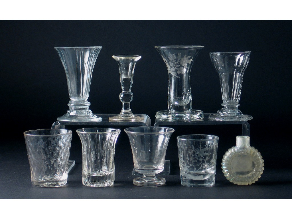Eight various small glasses, and a circular bottle with ribbed edges, 18th and 19th century. (9)