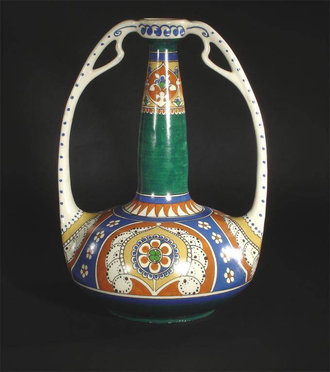 An Arnhem Pottery Lindus twin-handled vase painted in colours with panels of Art Nouveau flowers...