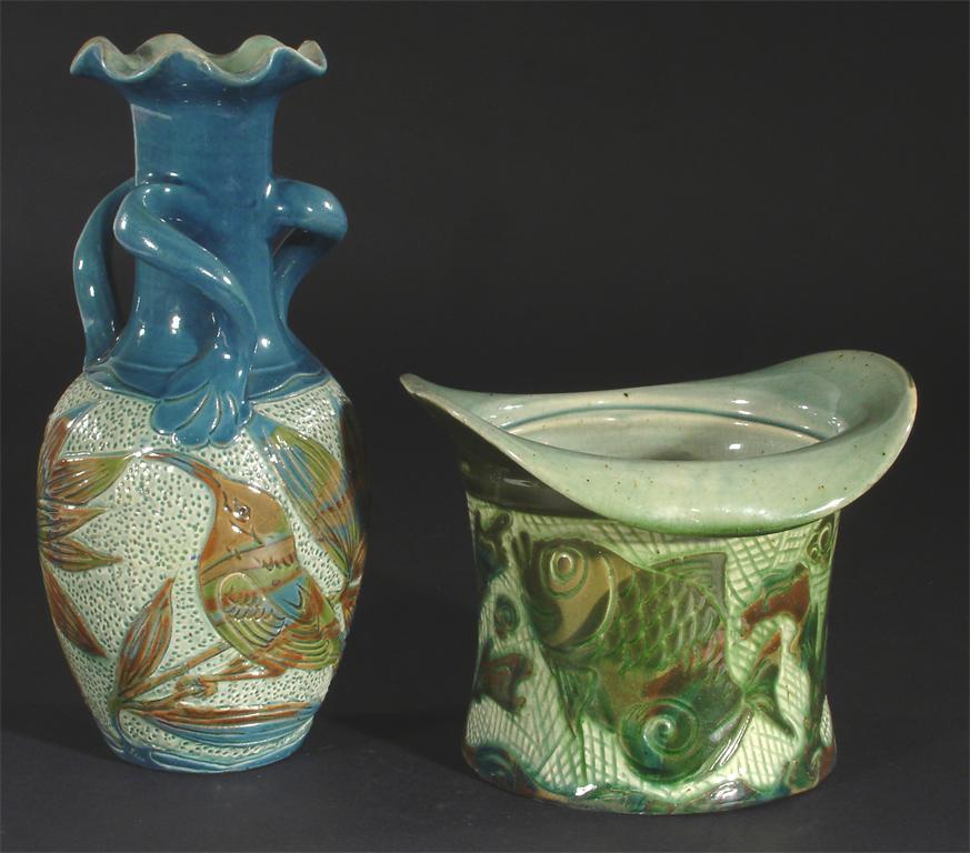 A Lauder Barum Pottery top hat centrepiece incised with scaly fish and a vase decorated with a...