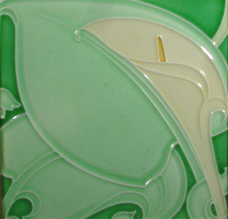 An Arts and Crafts tile the design attributed to C F A Voysey, decorated with a Calla Lily, in shades of cream and mint imporessed marks 15.5cm. square