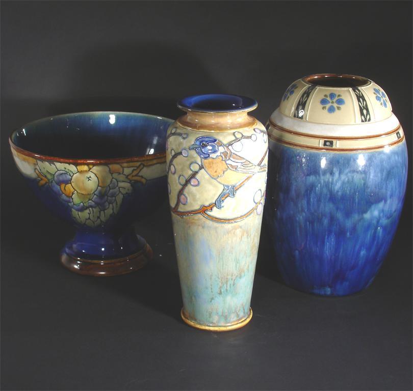 A Royal Doulton stoneware vase by Harry Simeon, tubeline decorated with a finch, in colours, and three others Doulton stoneware items, and a figure mounted on an onyx base various marks Simmeon 25.5cm. high