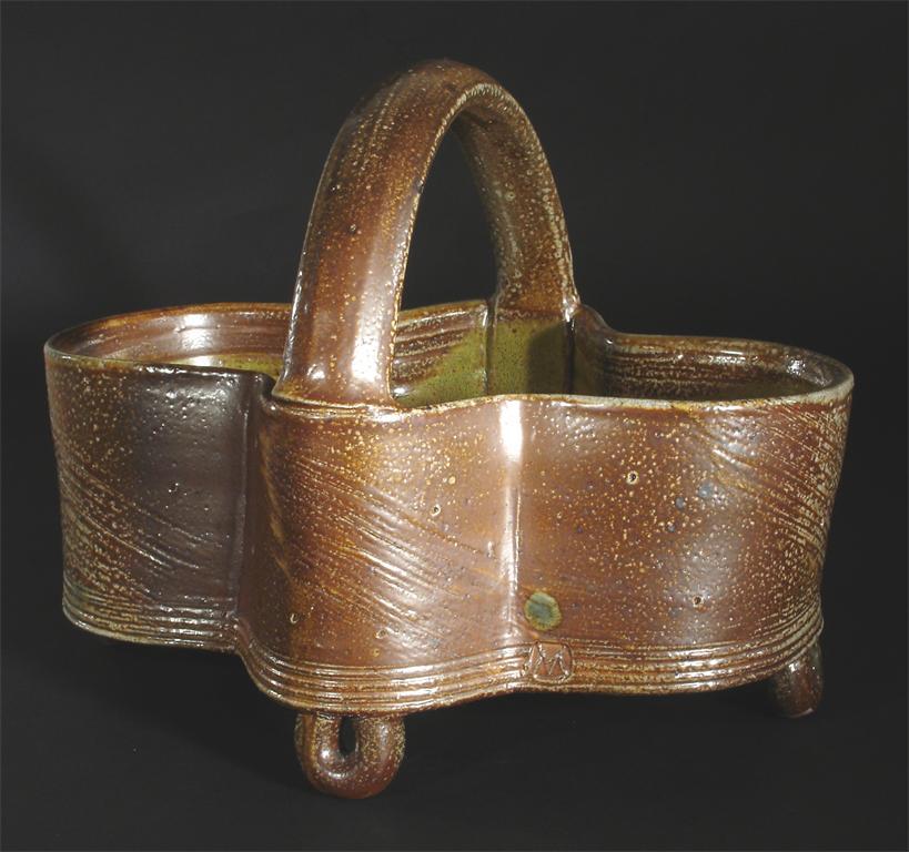 A Michael Casson stoneware basket covered in a mottled green/brown salt-glaze impressed artist...