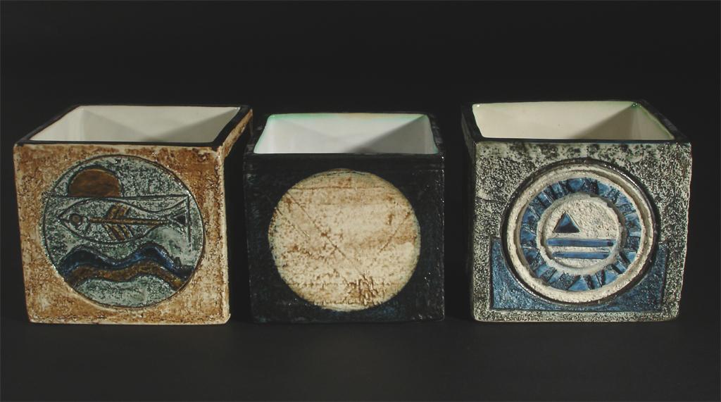 Three Troika Pottery Cube vases each painted in colours painted marks