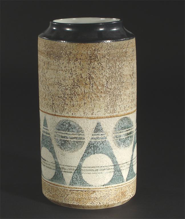 A Troika Pottery Cylinder vase painted in colours with geometric design painted marks 20cm. high