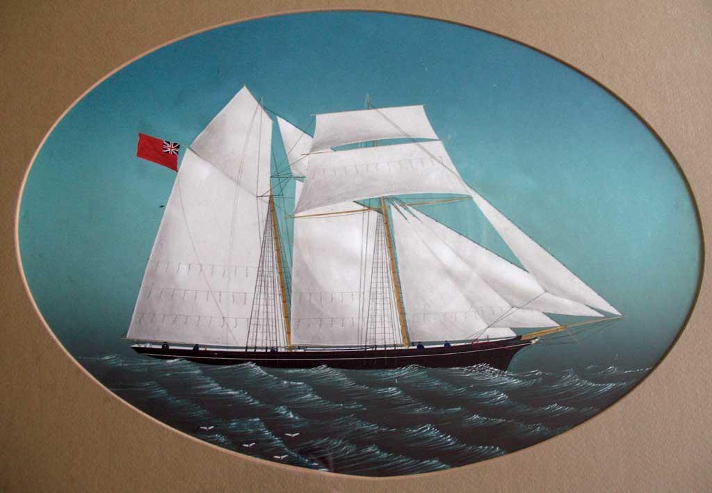 ENGLISH SCHOOL: A cutter in full sail, oval, gouache, 33 x 47cm (13 x 18.5in).